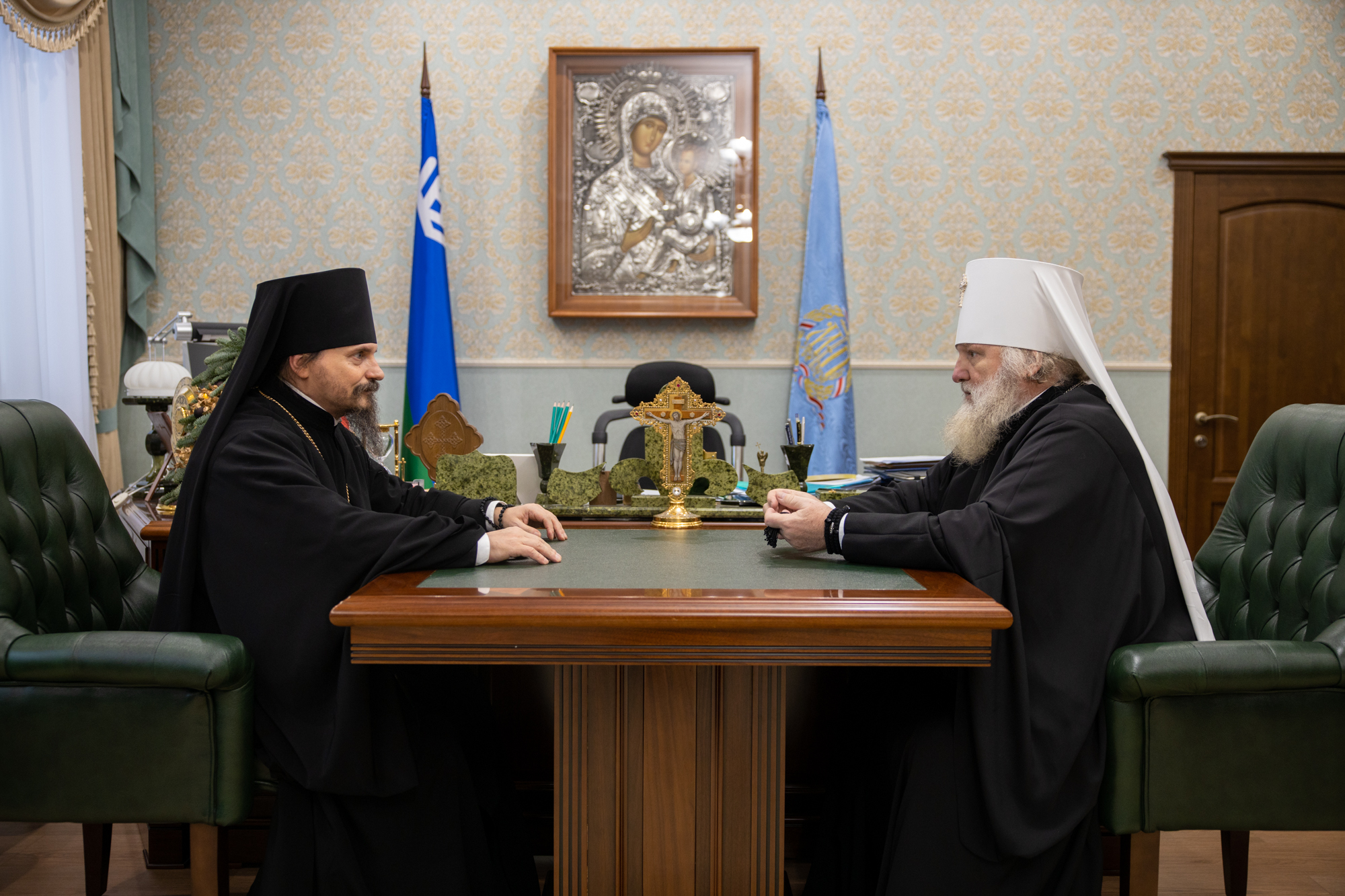На встрече были обсуждены текущие вопросы церковной жизни: о взаимодействии с приходами и социальными учреждениями, о подготовке к церковным праздникам и мероприятиям, вопросы взаимодействия епархий Ханты-Мансийской митрополии.