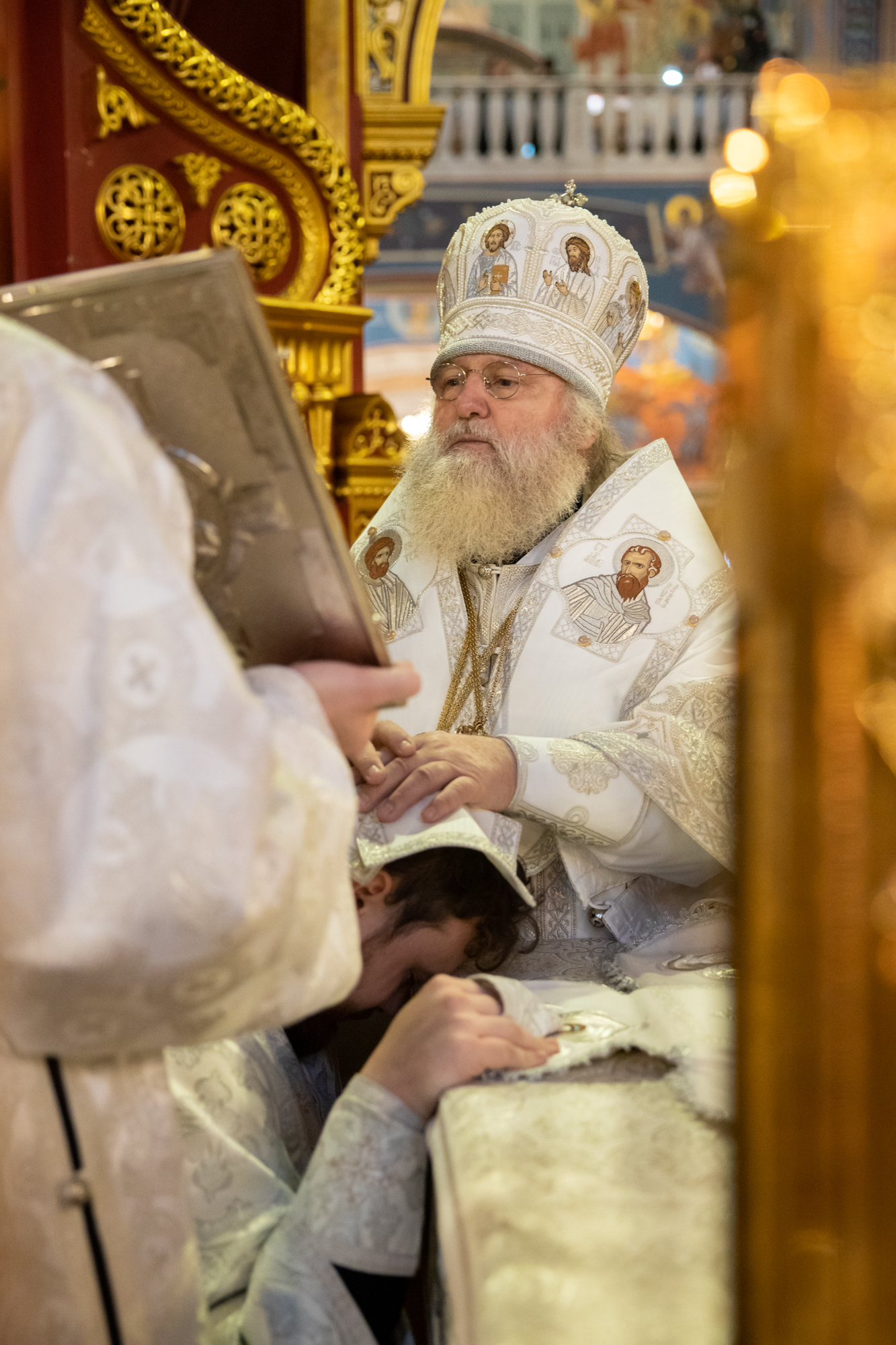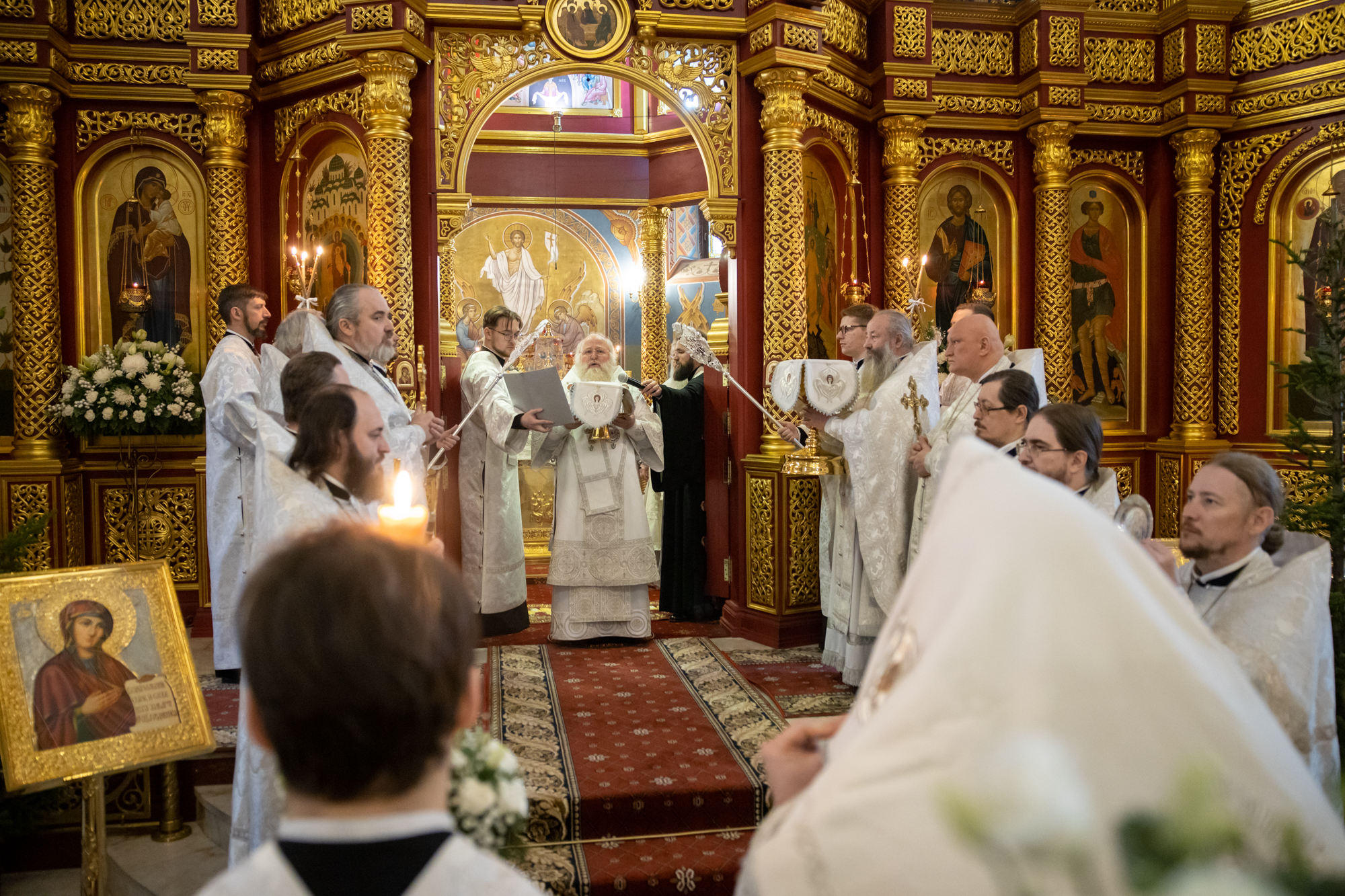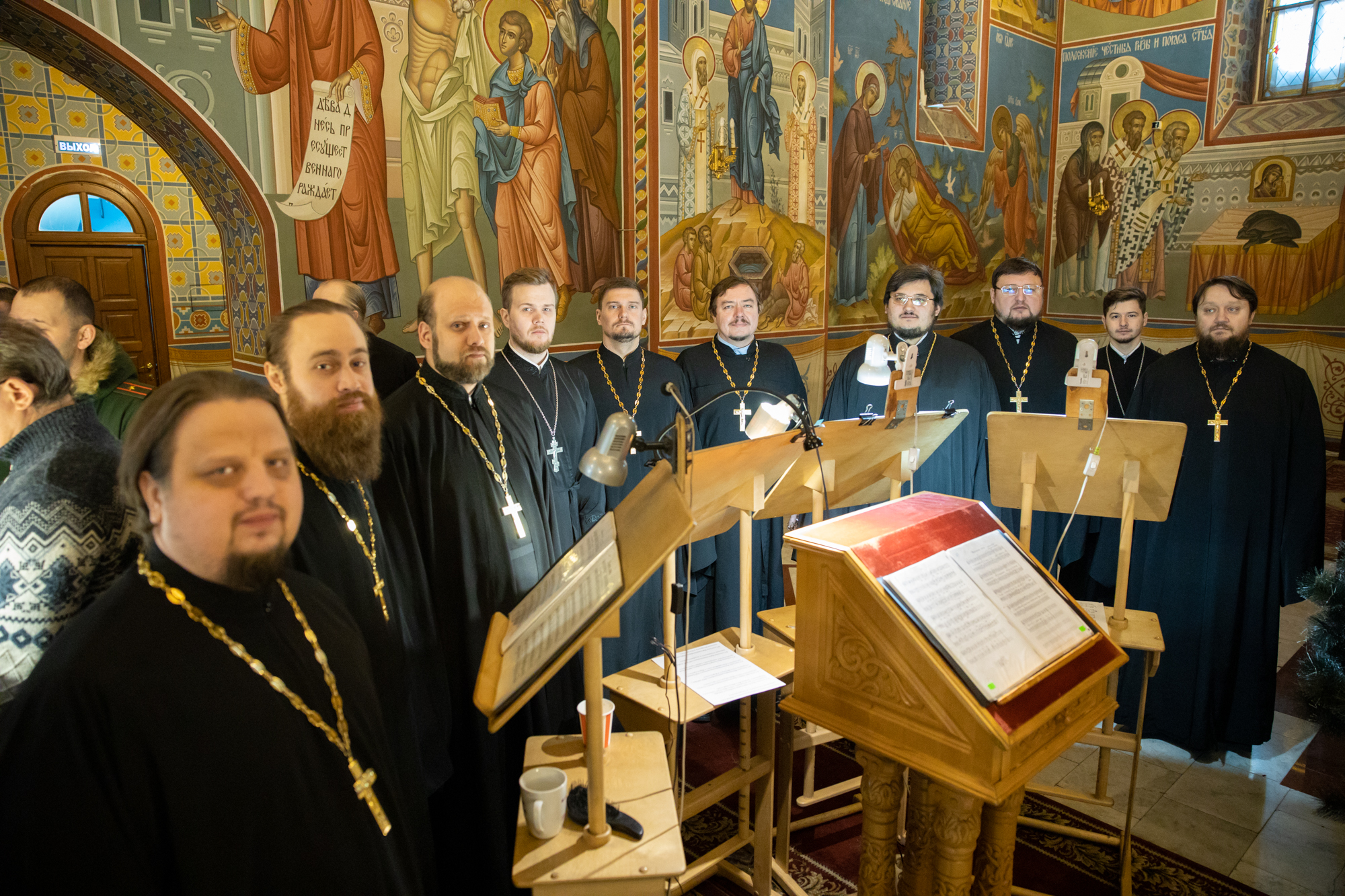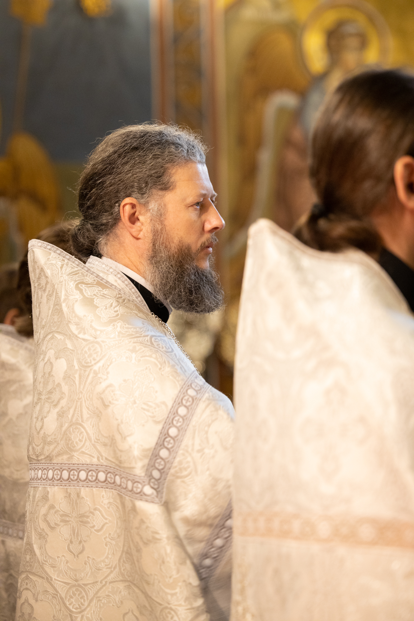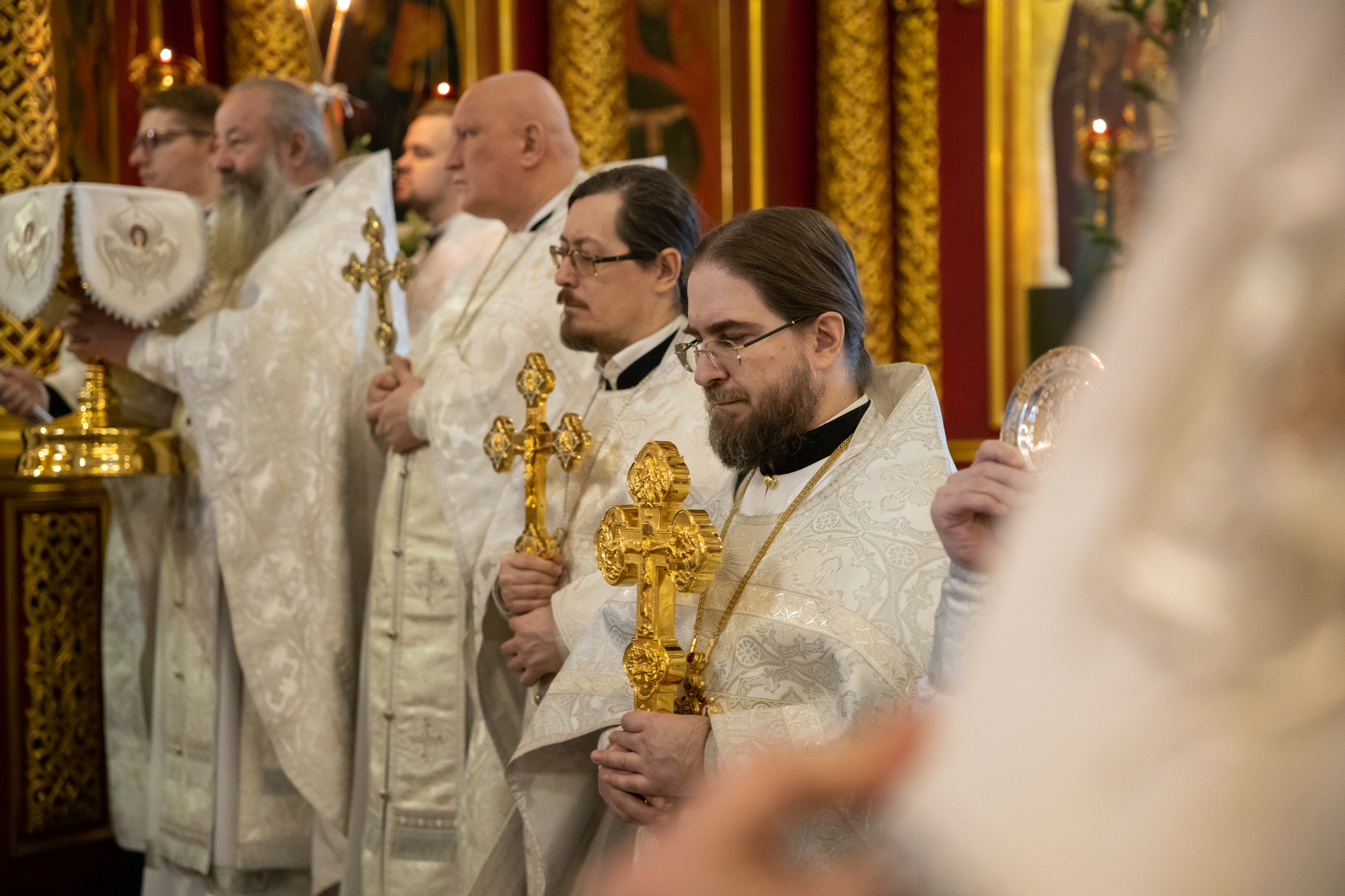Архипастырям сослужили: и.о. начальника Санкт-Петербургского подворья Спасо-Преображенского Валаамского монастыря игумен Иосиф (Крюков), секретарь Татарстанской митрополии иеромонах Кирилл (Корытко), настоятель храма иконы Божией Матери «Седмиезерная» г. Мытищи протоиерей Александр Мензелинцев, секретарь Филиппинско-Вьетнамской епархии иеромонах Корнилий (Молев), духовенство Ханты-Мансийской митрополии. Диаконский чин возглавил клирик Тихвинской епархии протодиакон Георгий Стефанов.