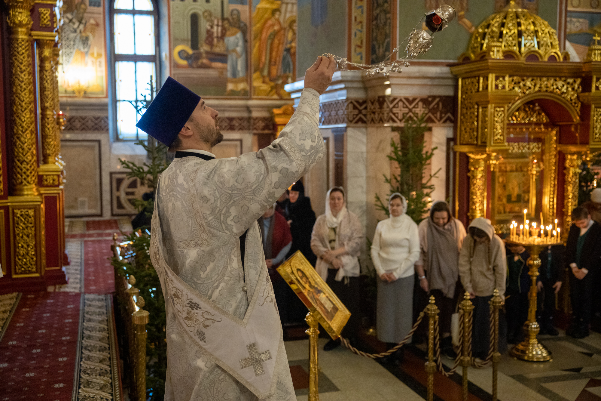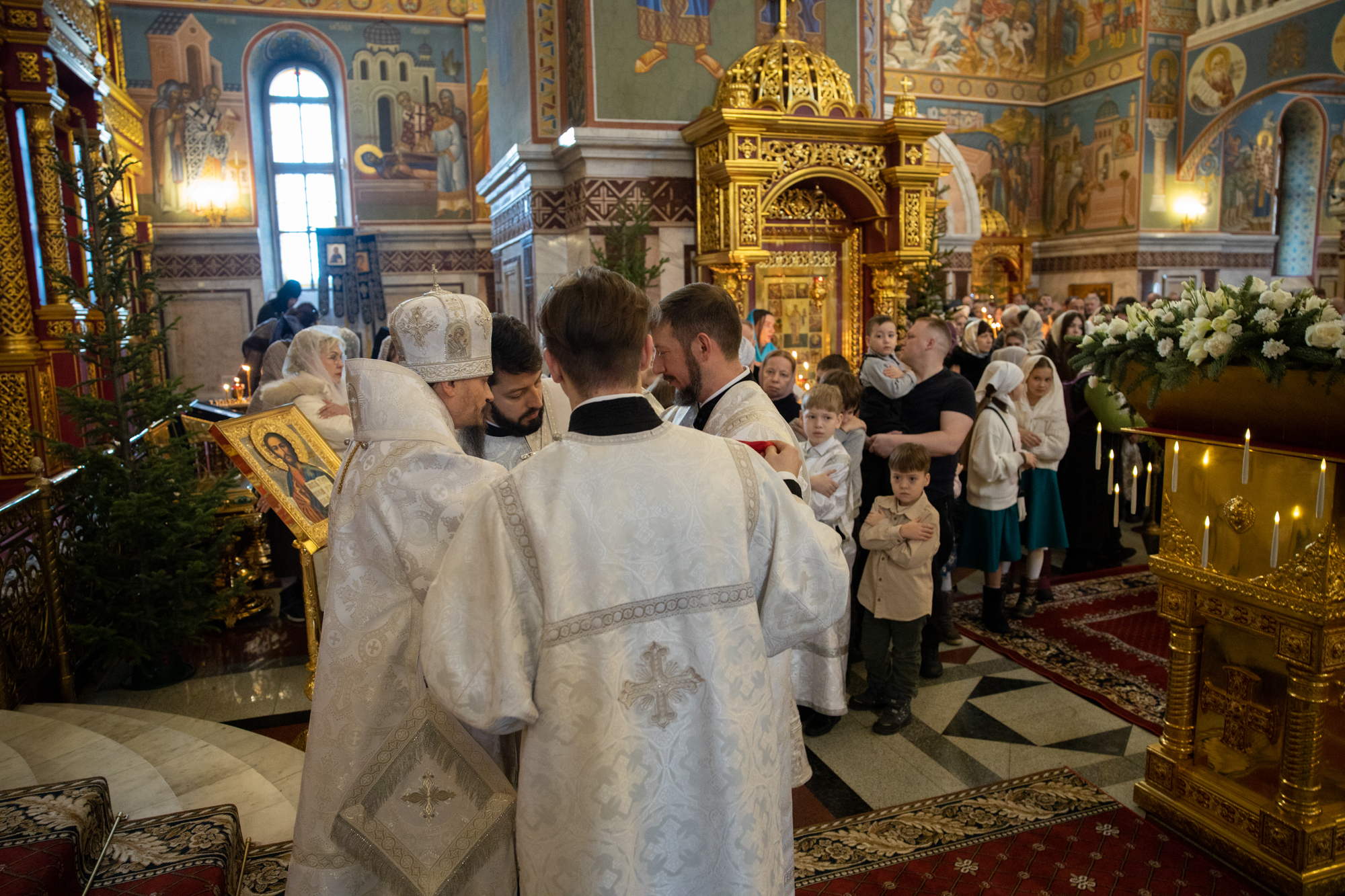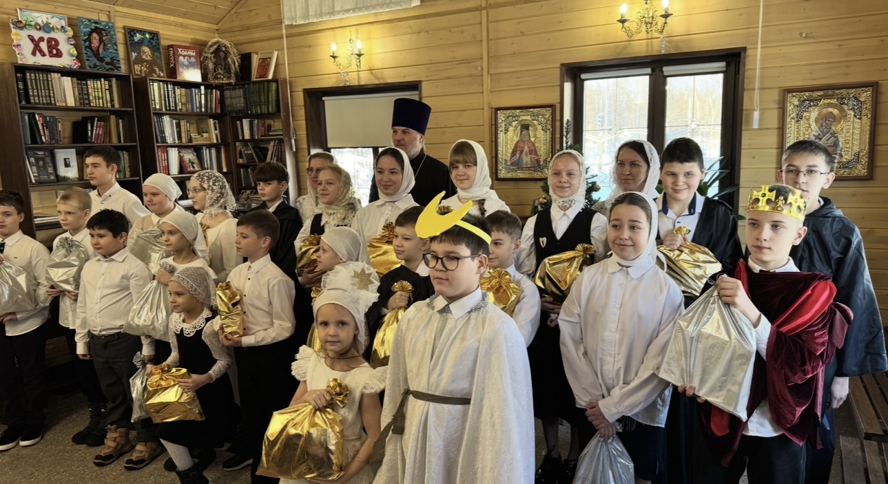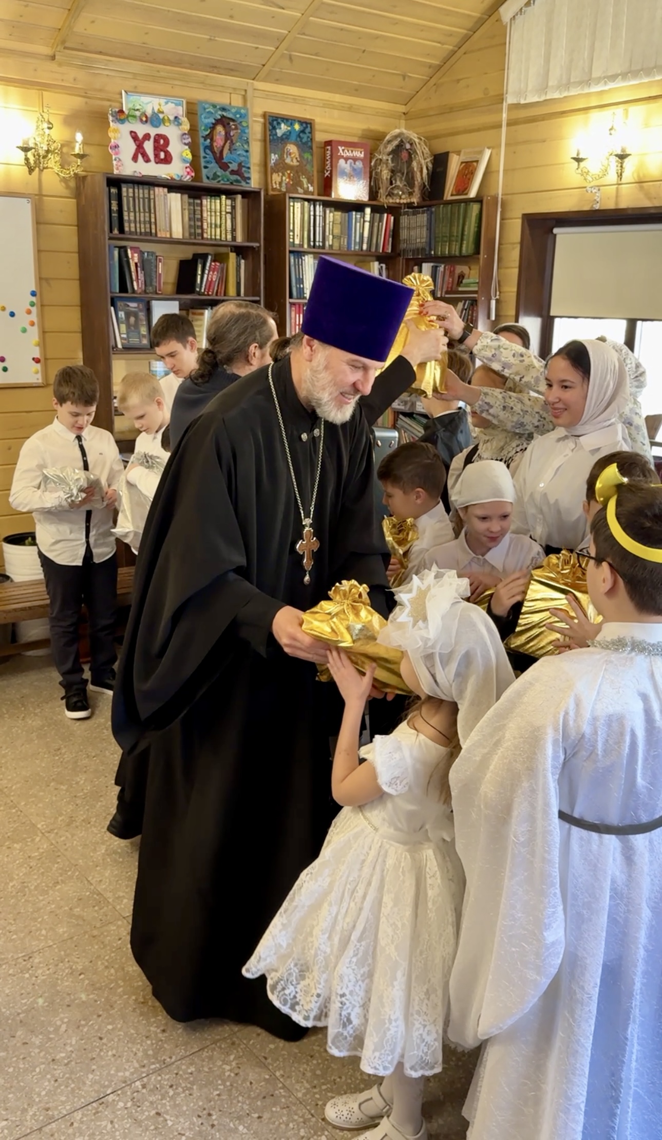 После Божественной литургии 11. 01.2026г. настоятель храма поздравил родителей и детей с Рождеством Христовым и наступившем Новым годом, обратился с напутственным словом и вручил подарки.
