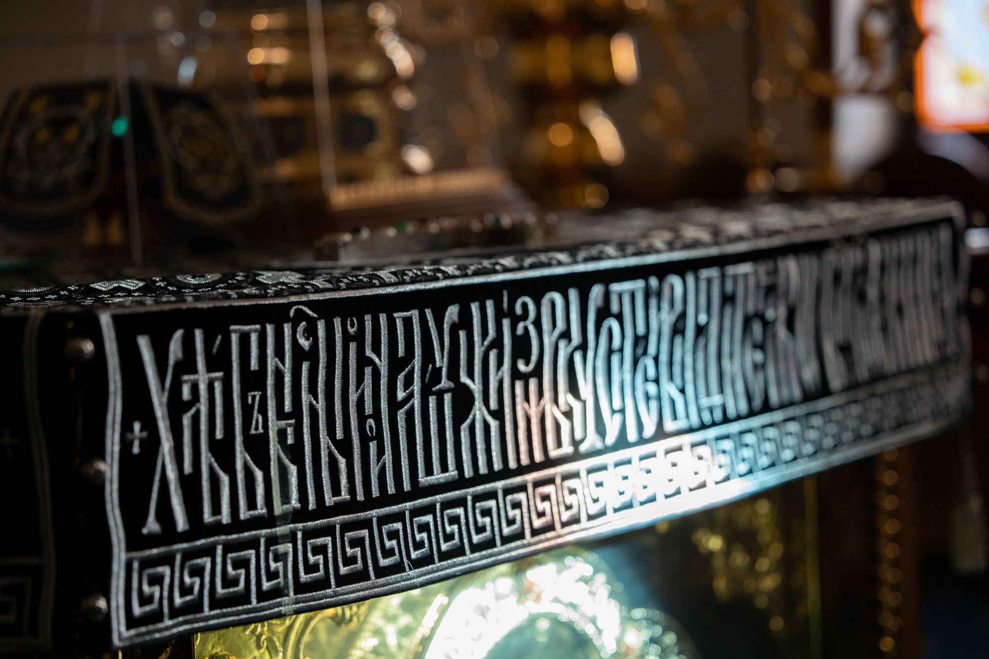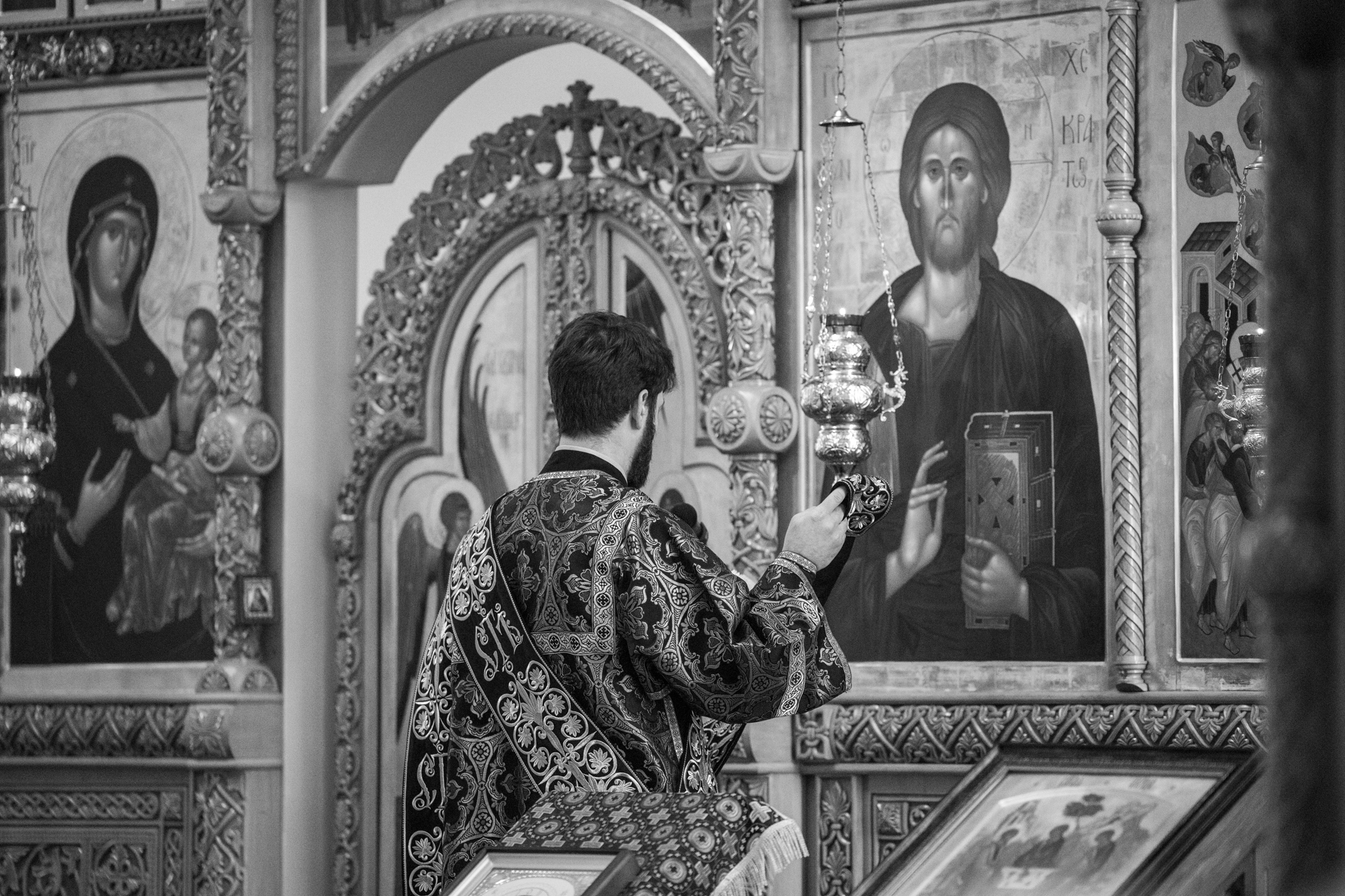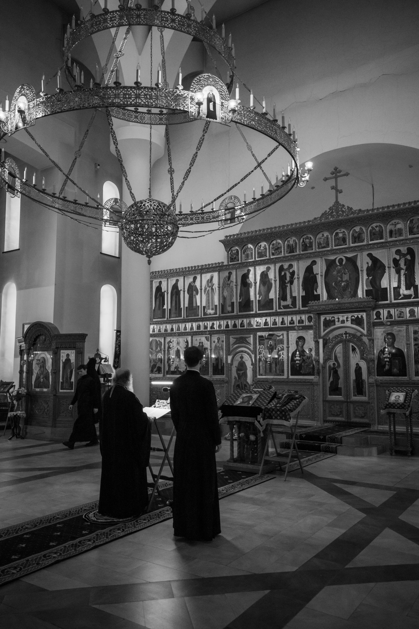 1. В убранстве храма преобладают черные тона. Свет во время богослужений включается редко.
