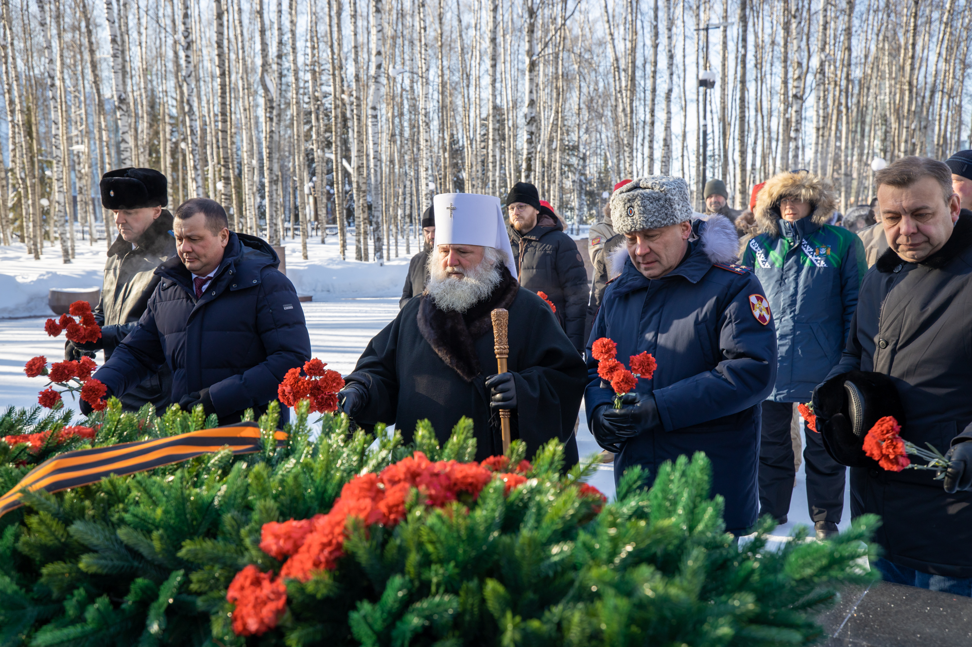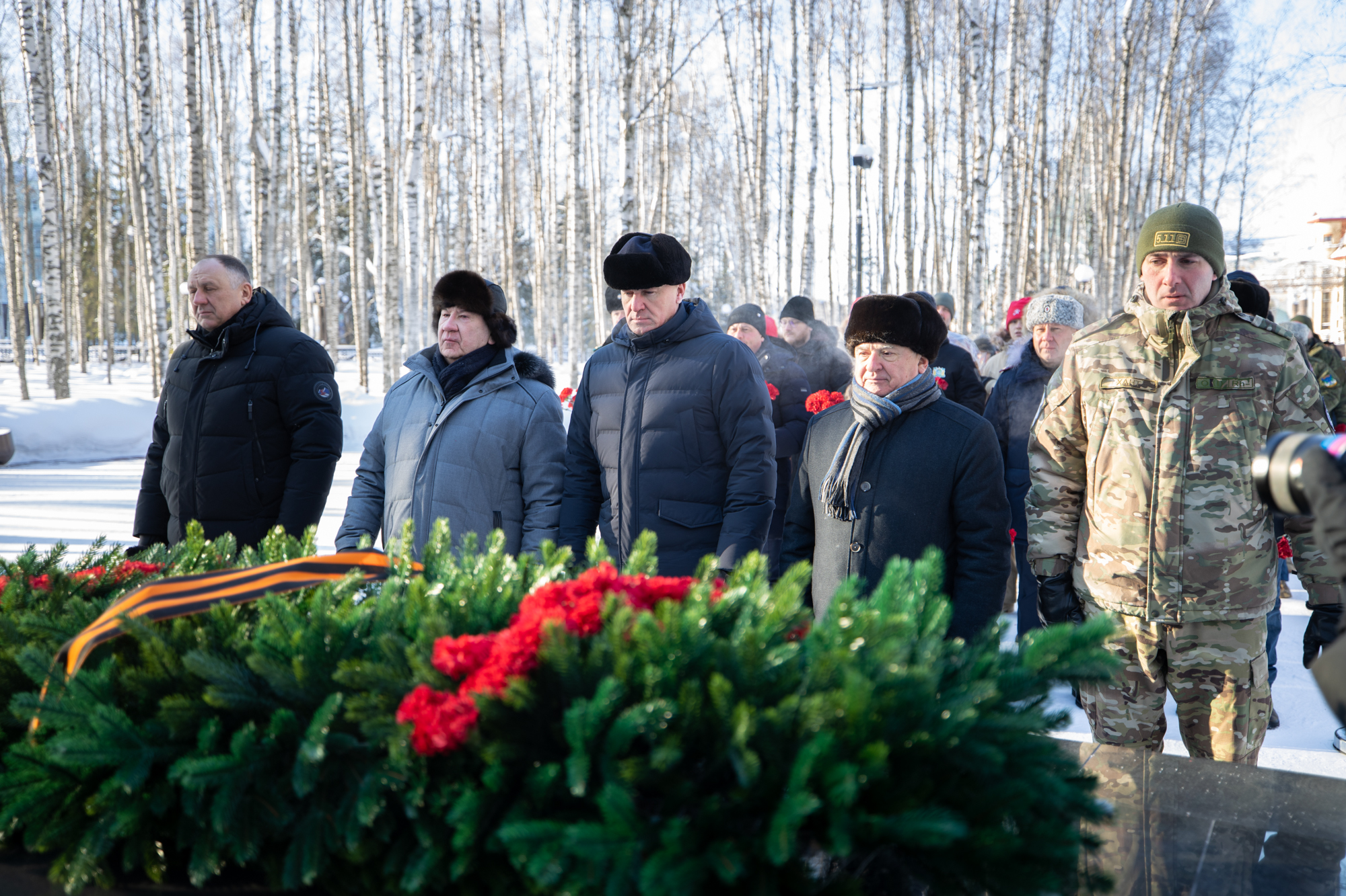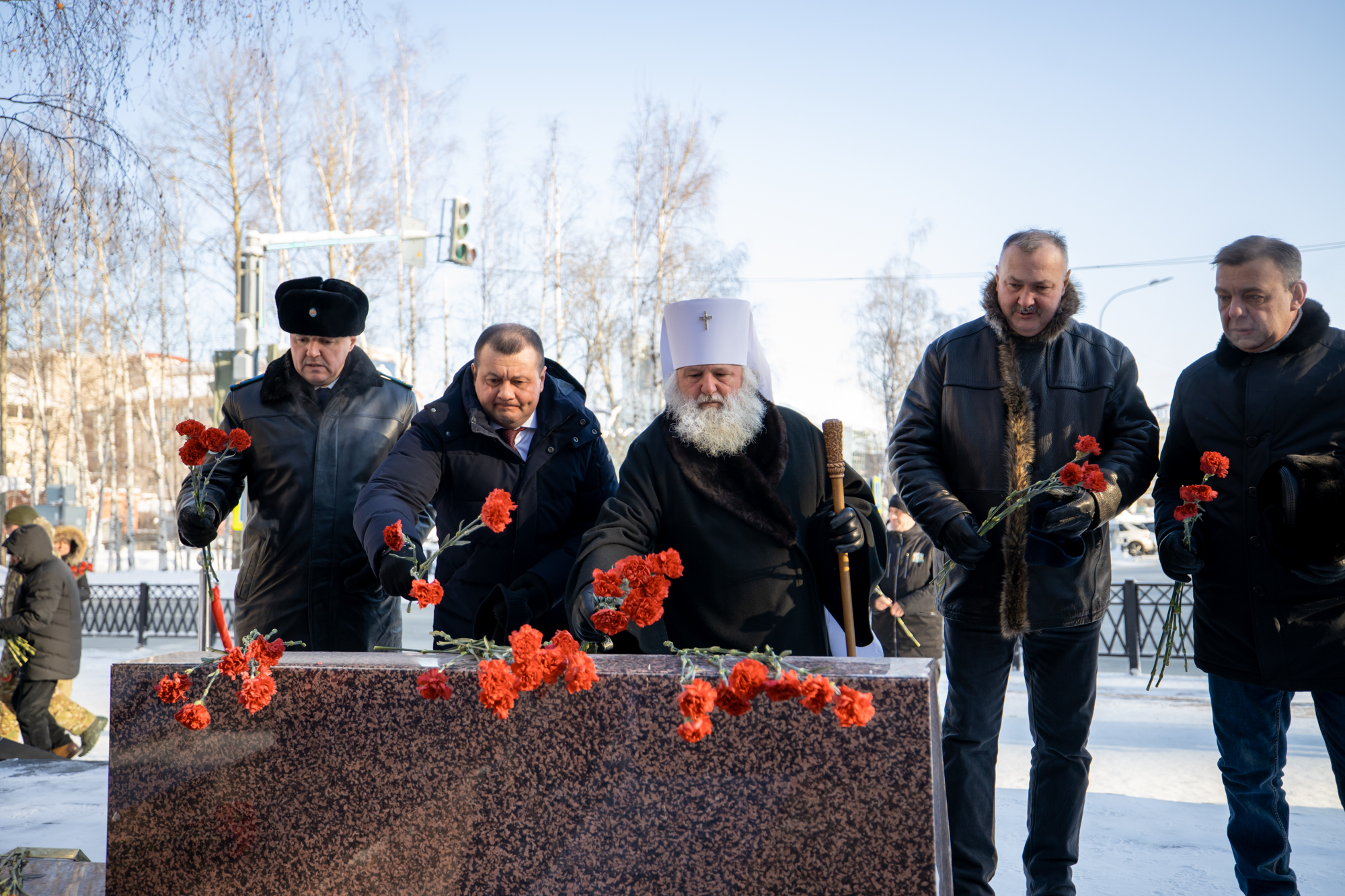 Губернатор Югры и Глава Ханты-Мансийской митрополии возложили цветы к Мемориалу Победы и памятнику погибшим в локальных конфликтах. Память бойцов почтили минутой молчания.