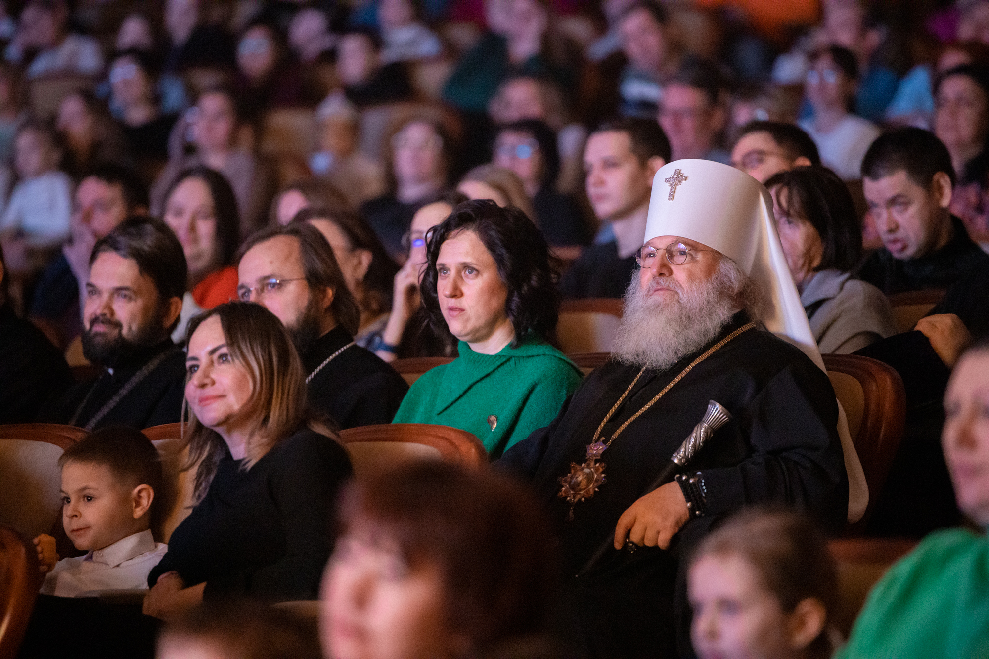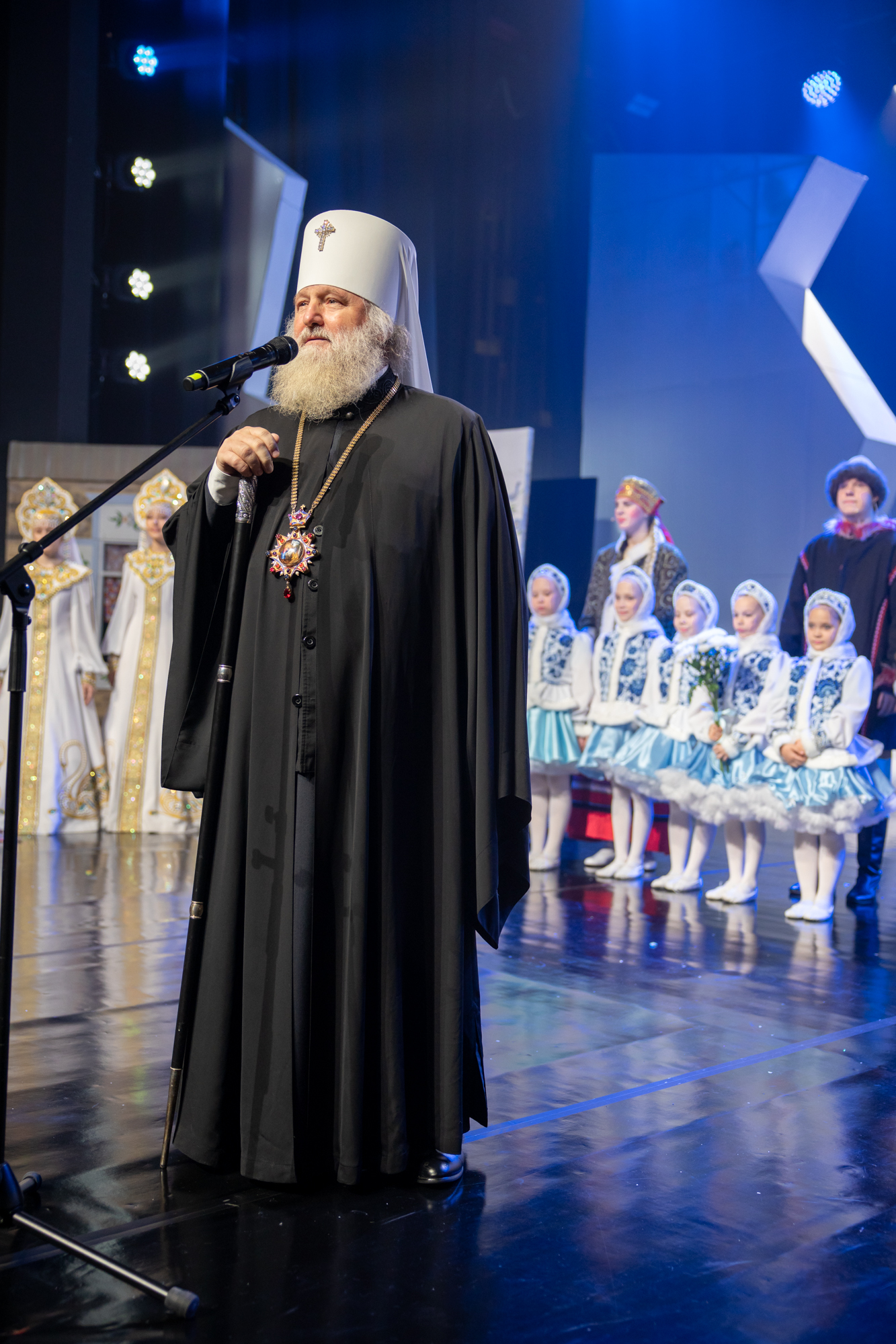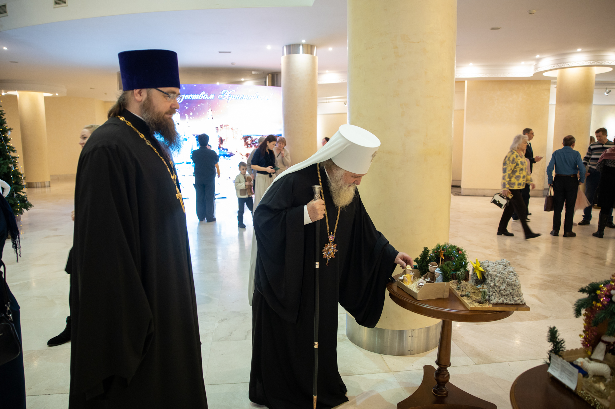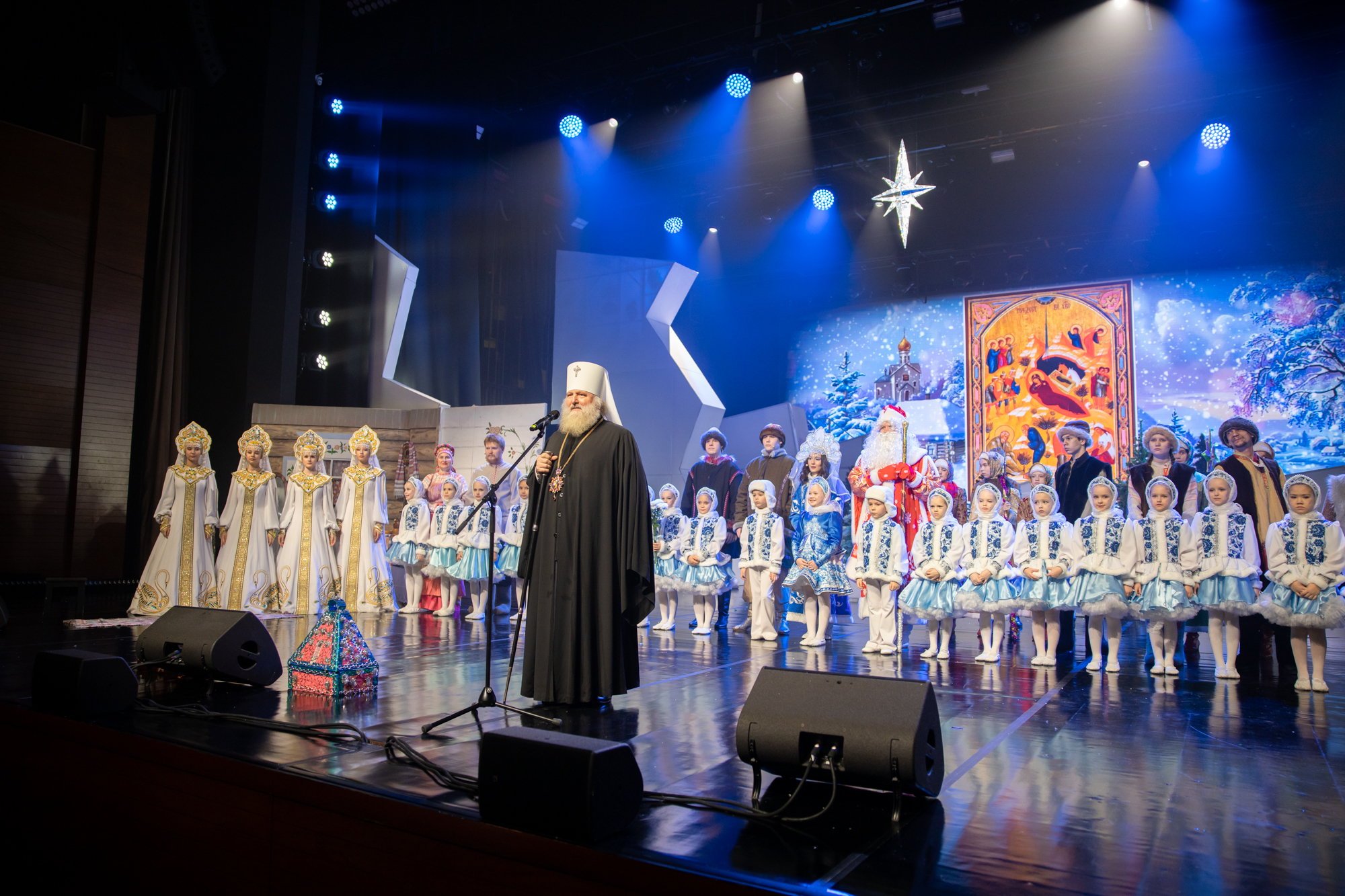 Сегодня, отмечая праздник Рождества, я хотел бы особо поблагодарить всех наших артистов, участников, организаторов, которые, действительно, донесли смысл и победы добра над злом. Эта сказка, связанная с Рождеством и с победой тех недобрых дел, которые происходят в нашей жизни. Они порой произвольны, потому что мы несовершенны. И, конечно же, нет человека, который бы в жизни жил и не согрешил. Но добро всегда повреждает зло. Есть мудрая мысль, такая сказана, философская. Если бы было зла больше в мире, то мир перестало бы существовать. А добра больше. Вот это добро, оно должно приумножаться и спектакль нам так четко, ясно рассказал об этом. Где гордость, где зависть, а все побеждается добром. Спасибо вам, что вы сумели донести до всех зрителей эту победу добра над злом и связали с праздником Рождества Христова. Это очень-очень важно сегодня и так необходимо для нас для всех. Я сердечно благодарю вас. Я надеюсь, что и дальнейшее такое сотрудничество будет митрополии нашей и, конечно же, наших учреждений, всех организаций, которые сегодня участвуют в этом мероприятии, в спектакле, в реализации его. Я думаю, что будем совершенствовать и проводить такие мероприятия уне только традиционно в Рождество и Пасху, но и к праздникам большим в течение года. Мы об этом подумаем вместе с администрацией округа, чтобы действительно жизнь духовная, культурная, патриотическая, добрая, чтобы добро царствовало и приумножалось в нашей жизни. А будет добра больше, тогда у нас меньше зла будет, меньше войн будет, меньше будет разногласий, будет согласие, мир, тогда и Господь будет с нами. Всех, мои дорогие, поздравляю еще раз с праздником Рождества Христова. Пусть Всемилостивый Господь дарит нам эту радость на протяжении года. Благодарим вас, мои дорогие артисты, участники, организаторы. Дай Бог здоровья, помощи Божией!»