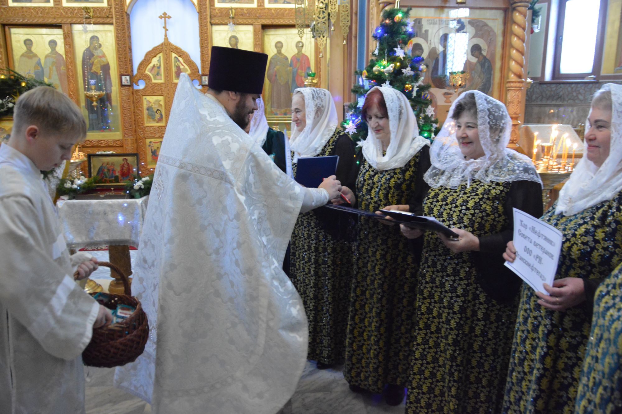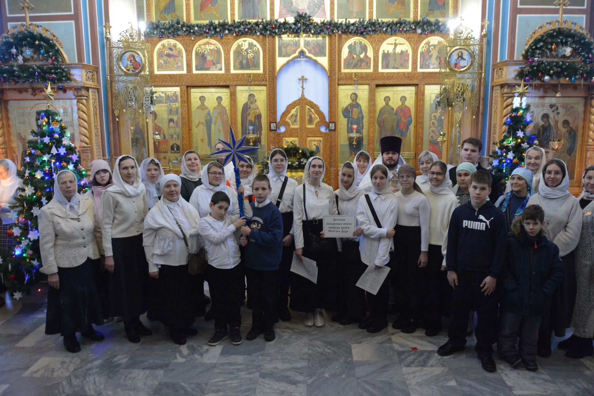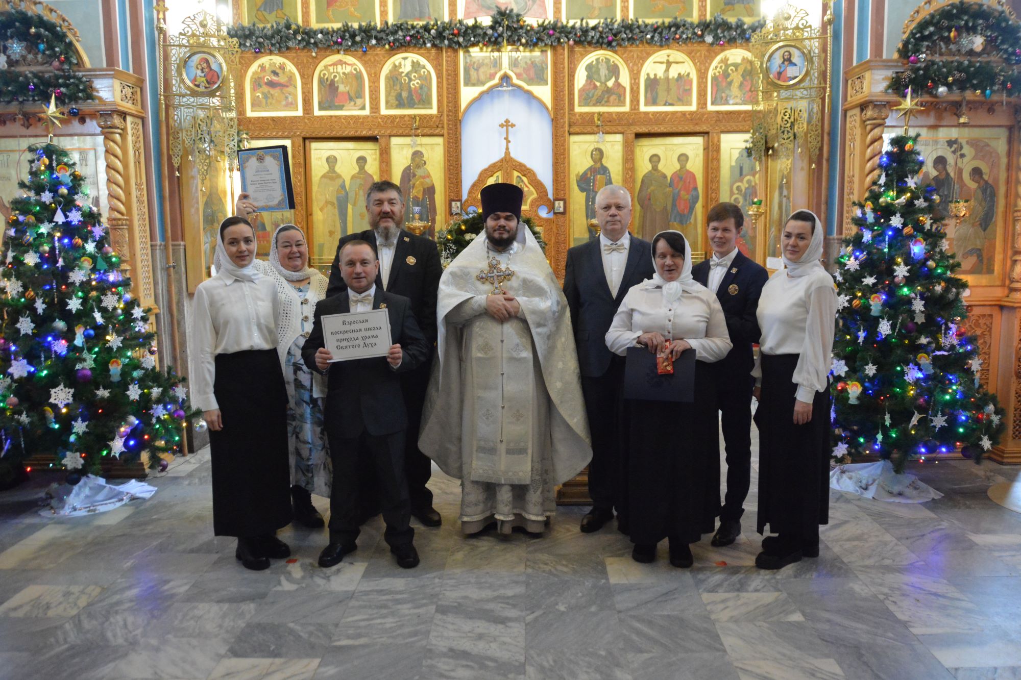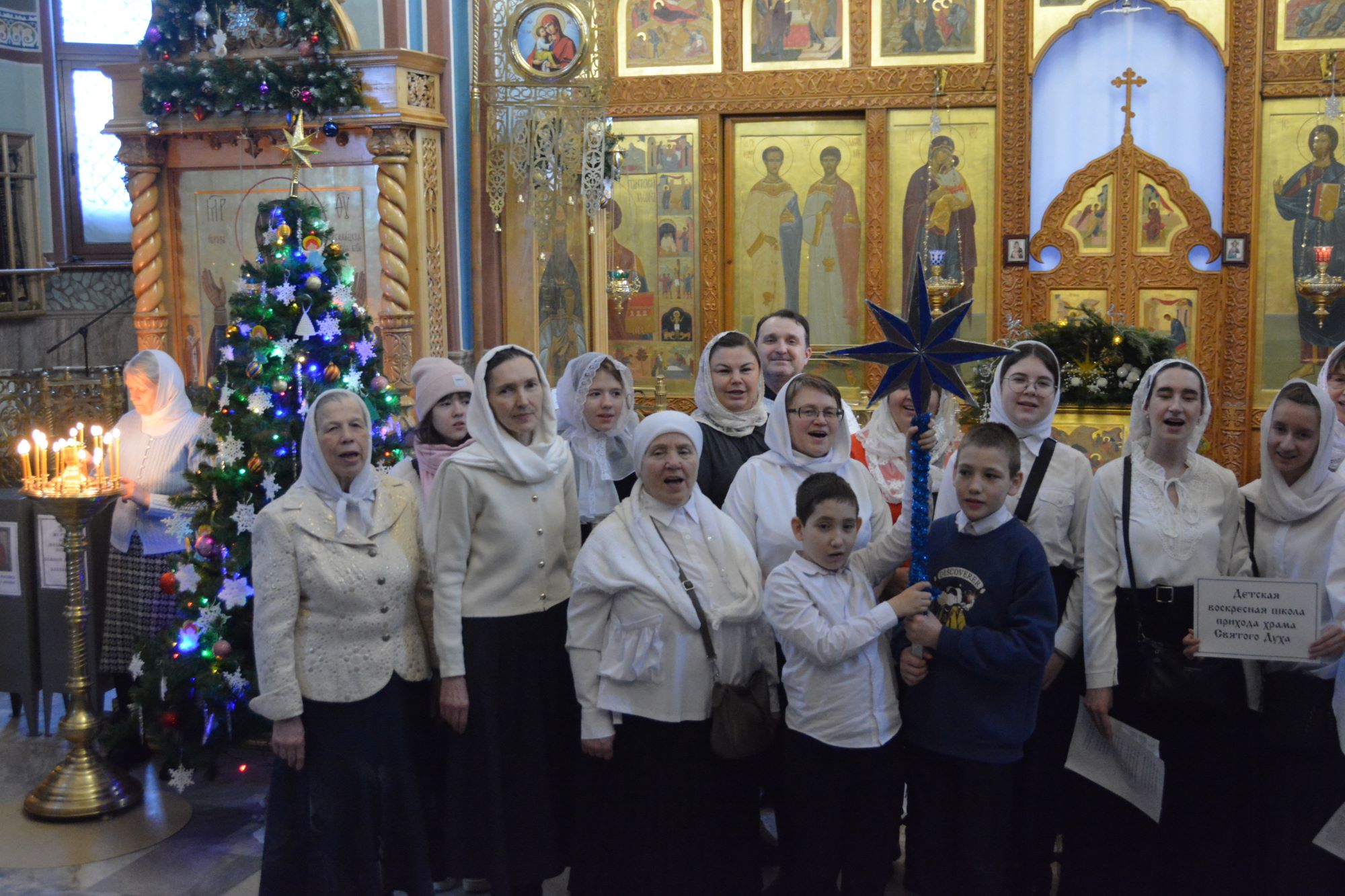 07.01.2026 в храме Святого Духа города Нефтеюганска состоялся конкурс колядок. Хоровые коллективы храма, хор ветеранов и все желающие прихожане пели Рождественские колядки, славя родившегося Христа. Среди участников были дети Воскресной школы, хор ветеранов компании Роснефть, вновь созданный хор из слушателей взрослой Воскресной школы. Иерей Федор Максимов всем коллективам вручил диплом и каждому участнику сладкий подарок — шоколадку. Многие пришедшие в храм на минутку горожане, останавливались и с радостью слушали Христославов, присоединяясь к их стройному хору.