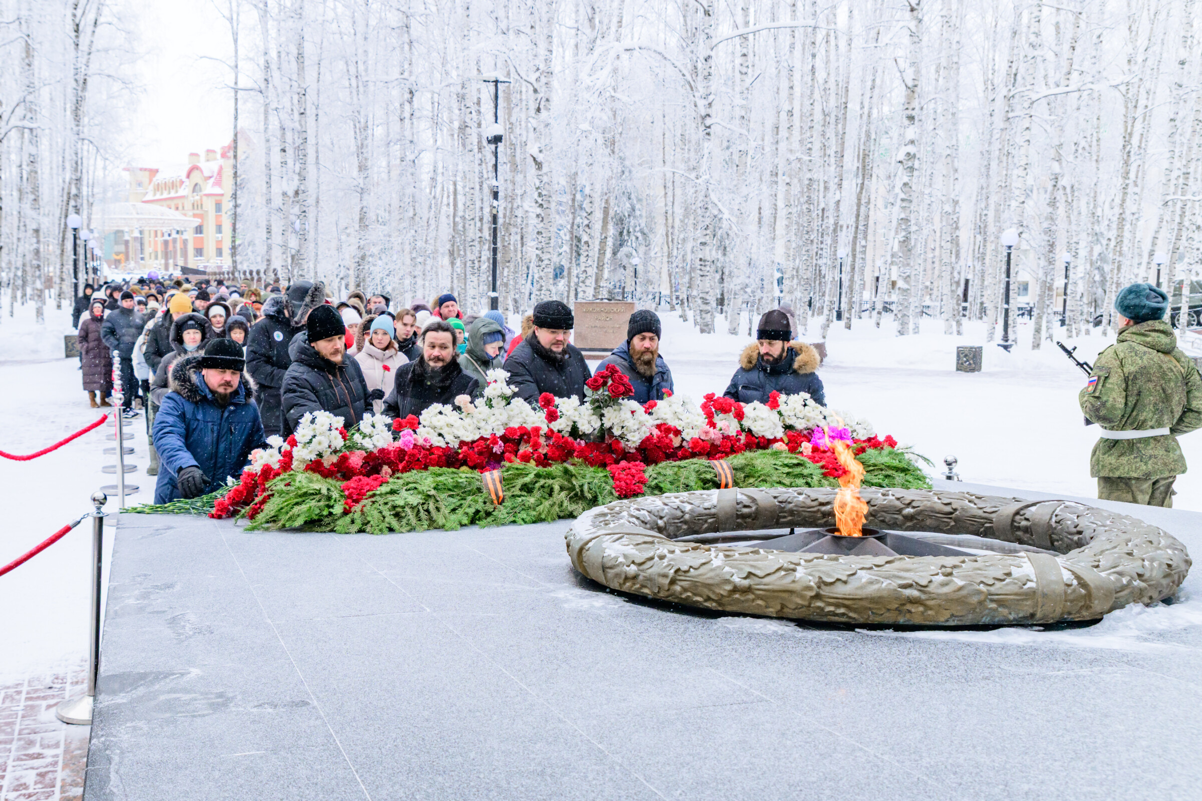 В торжественной церемонии возложения цветов к Вечному огню приняли участие духовенство города Ханты-Мансийска, представители Правительства региона, депутаты Думы Югры и Ханты-Мансийска, сотрудники городской Администрации, ветераны, активисты общественных организаций, волонтеры и неравнодушные жители окружной столицы.