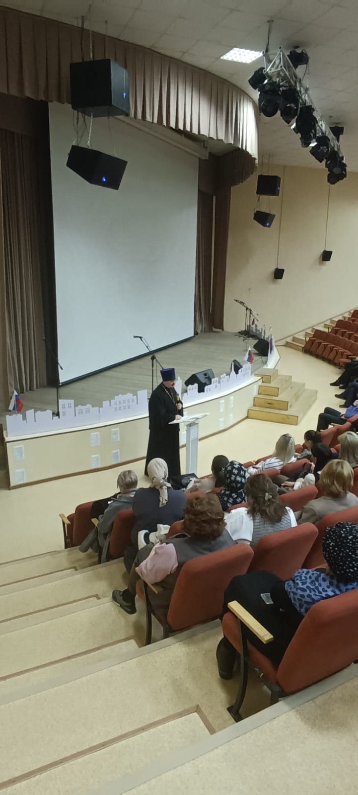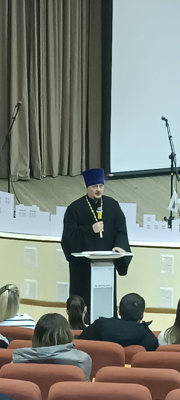 В своем выступлении перед аудиторией учащихся и педагогов настоятель Прихода храма Святой Троицы иерей Иоанн Дарий, во-первых, поздравил присутствующих с большим православным праздником Покрова Пресвятой Богородицы. Промыслительно, что мероприятие, проводимое в стенах школы, запланировано именно на этот день. Мы живем в православной России, где испокон века учили уважать свою веру, отца и мать, свою семью – малую церковь и держать ответственность за защиту своей Родины. С малых лет прививается детям уважительное отношение к своим соотечественникам, оказание помощи ближнему, быть соучастником добрых дел, продолжателем дел своих предков, учили беречь мир и добрососедские взаимоотношения. Сейчас, во время проведения Специальной военной операции мы должны помнить тех, кто ценой своей жизни защищает нашу мирную жизнь и любым способом стараться помочь тем, кто находится в тяжелейших условиях жизни! Благодарим тех, кто оказывает материальную помощь в поддержку ребят на передовой, кто плетет маскировочные сети, собирает посылки с вещевой и продовольственной помощью, не жалея средств и времени. Вместе мы справимся с бедой!