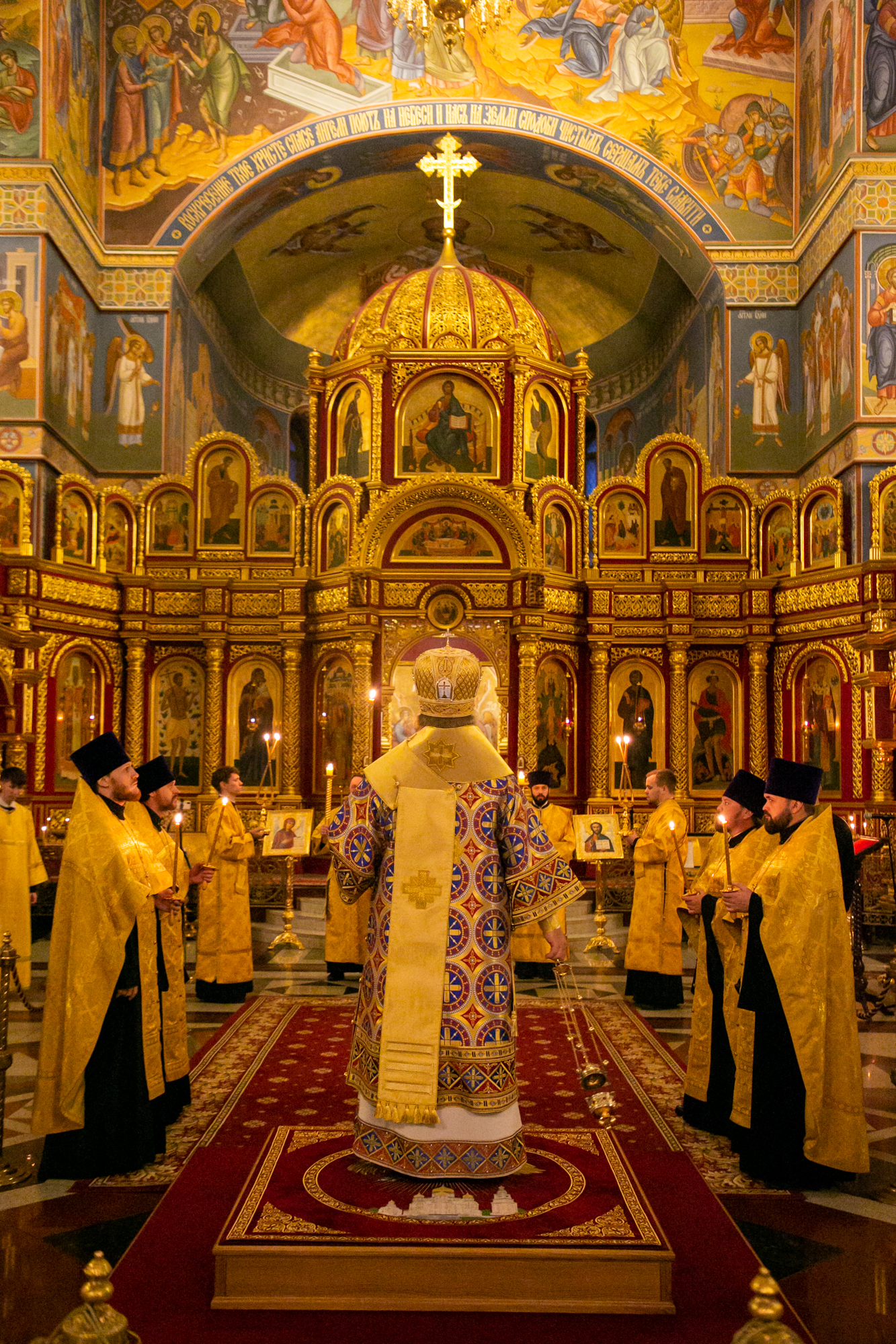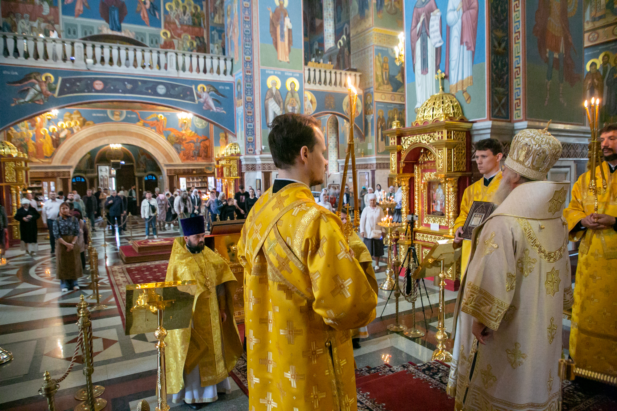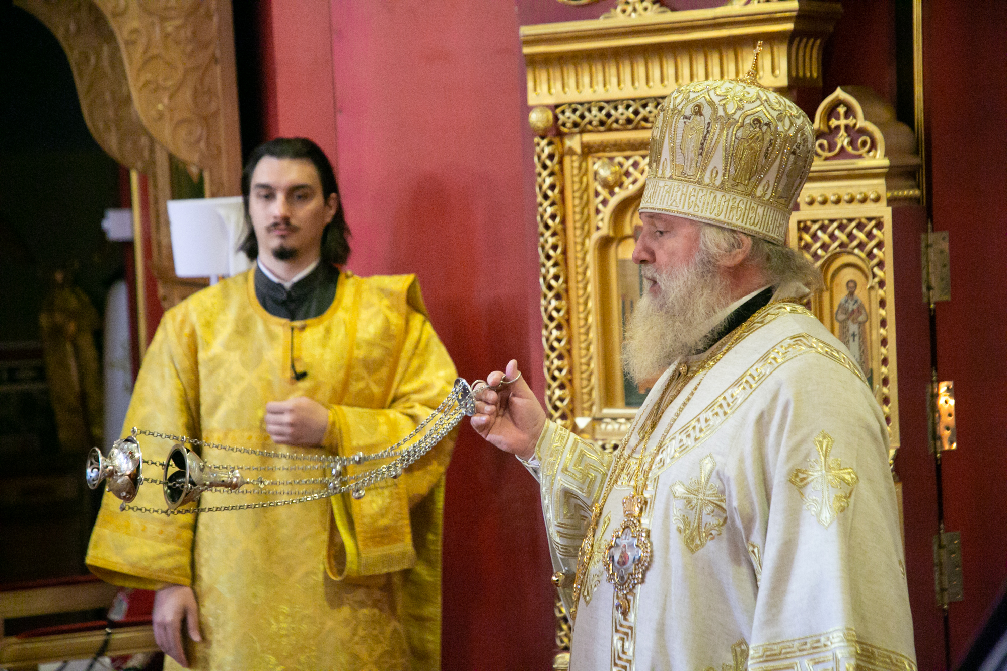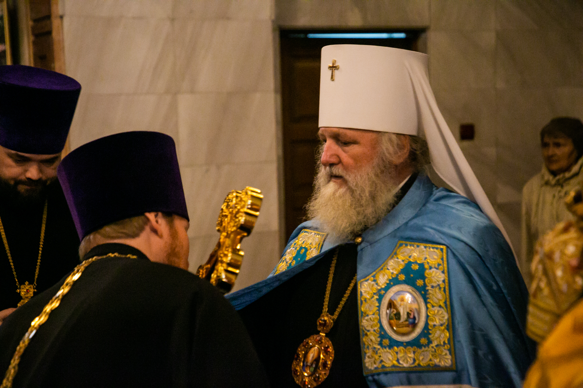 Его Высокопреосвященству сослужили: благочинный Ханты-Мансийского благочиния иерей Димитрий Губанищев, ключарь собора иерей Александр Петюр, духовенство собора.