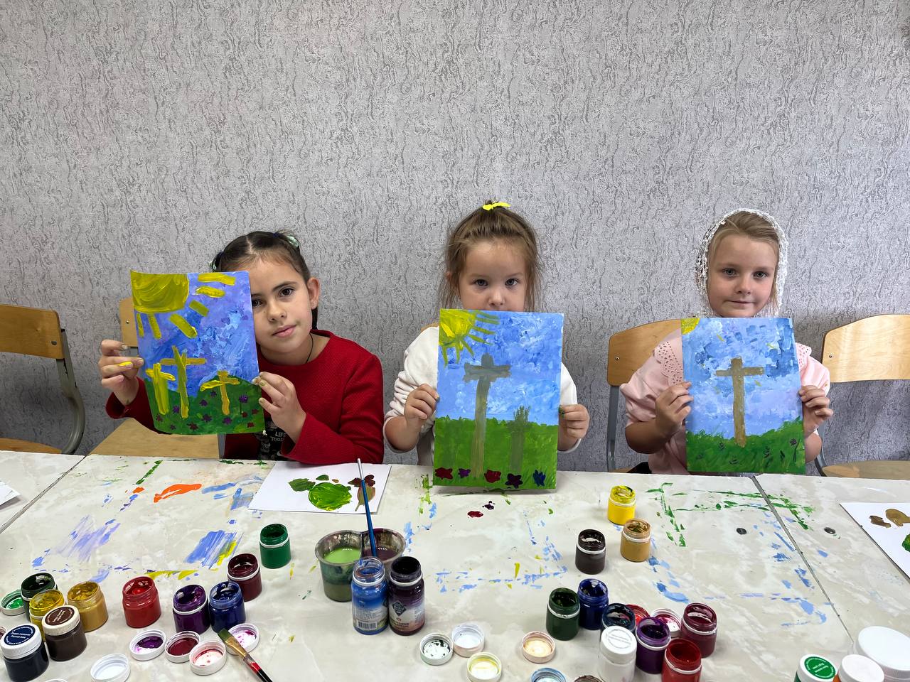 Самые младшие воспитанники Воскресной школы на занятии, посвященном храму Покрова Пресвятой Богородицы города Ханты-Мансийска изготовили юбилейные открытки «Храм Покрова»