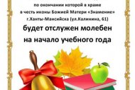 28 августа 2022 года в храме в честь иконы Божией Матери "Знамение" (г. Ханты-Мансийск, ул. Калинина, 61) в 09:00 Часы. Божественная Литургия, по окончании будет отслужен молебен на начало учебного года.