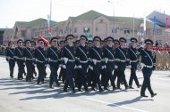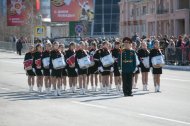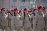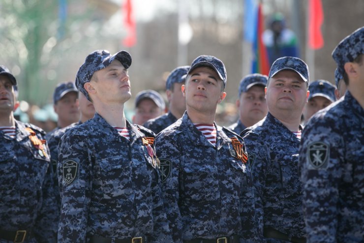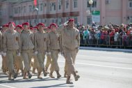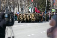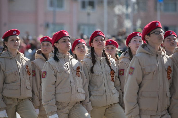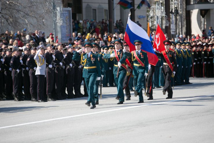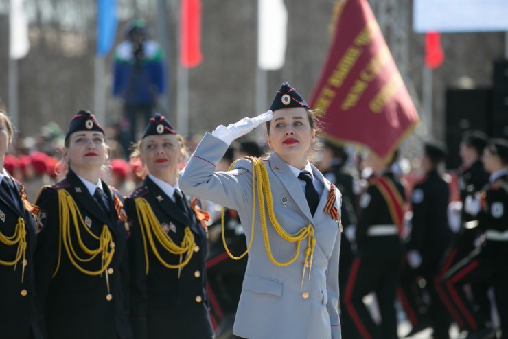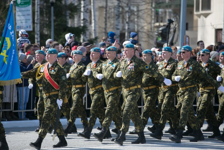 По улице Мира торжественным маршем прошли 15 парадных «коробок» — сотрудников пограничной службы, органов МВД России, регионального управления МЧС, муниципальных предприятий, бойцов Росгвардии, ветеранов Воздушно-десантных войск и войск специального назначения в Ханты-Мансийске, учащихся кадетских классов и юнармейцев.