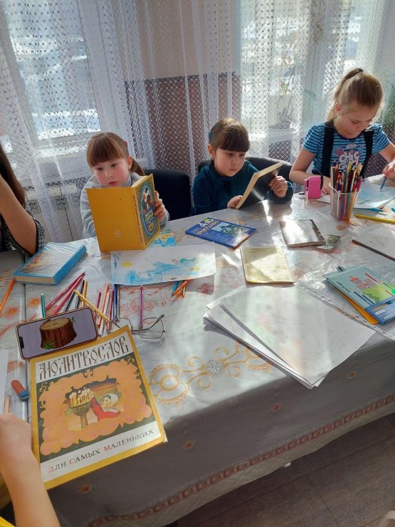 Педагог воскресной школы Прихода храма в честь иконы Божией Матери «Знамение» Леготина Галина Юрьевна принесла на выставку книги ее семьи. И пошел разговор о Слове, о Детской Библии, о молитвах. Детям хотелось поддержать разговор, поразмышлять и высказать свою точку зрения. И ведь их точки зрения были правильными, христианскими. Книги художественного содержания не зачастую несут таинственности и радости приключений, что обычно любят дети. Перед учениками воскресной школы лежали рассказы о православных святых, воинах, мучениках и подвижниках. Но! Книги передавались из рук в руки ребятами. Оказалось, и это привлекает их внимание. Жаль, правда, что в таких книгах мало иллюстраций. Ведь тема повествования им интересна, а вот завлечет ли их процесс чтения, это вопрос к издателям. И тут же мы предложили выход из подобной ситуации.