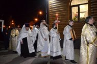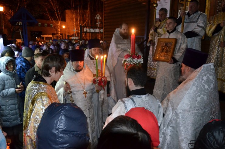 Ровно в полночь священнослужители в праздничных облачениях в алтаре трижды пропели стихиру: «Воскресение Твое, Христе Спасе, Ангели поют на небесех, и нас на земли сподоби чистым сердцем Тебе славити». Затем, выйдя из алтаря, вместе с народом обошли вокруг храма крестным ходом с пением той же стихиры. Крестный ход вокруг храма был совершен трижды при непрерывном трезвоне колоколов, возвещающих о приближении воскресения Христова.