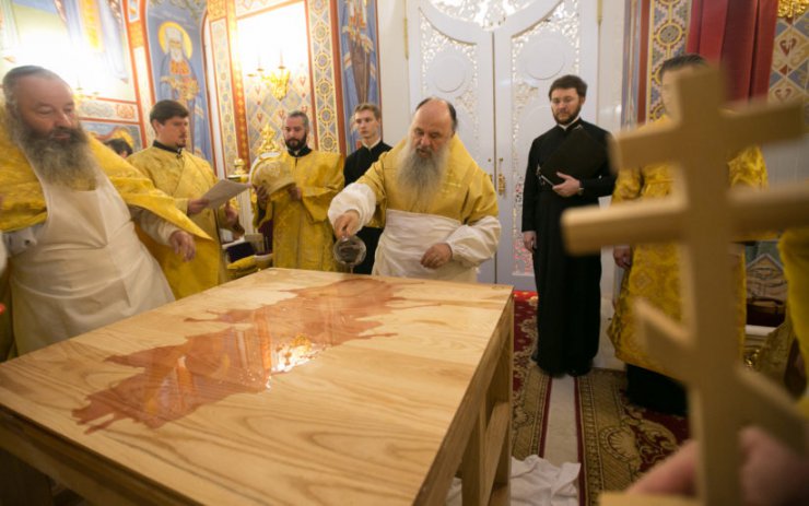 Его Святейшеством были освящены два престола — верхний в честь святой мученицы Татианы, нижний — в честь святых благоверных князя Петра и княгини Февронии Муромских.