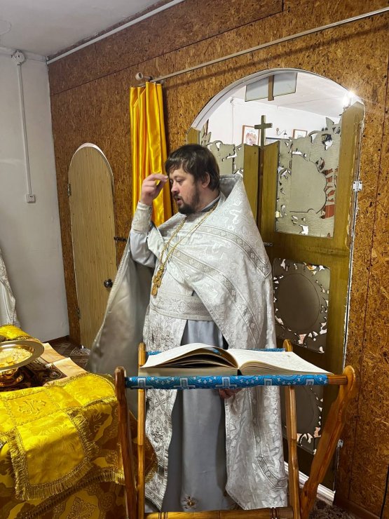 в сопровождении алтарника храма Чередова Д.П., певчих хора Родиной И.В., Кирилиной Т.И., где совершил Божественную Литургию в храме в честь иконы Божией Матери «Всех скорбящих Радость». За праздничной литургией исповедалось и причастилось пять человек. По окончании богослужения отец Леонид поблагодарил всех молящихся за общую молитву, поздравил с праздником Сретения Господня, затем освятил один дом.
