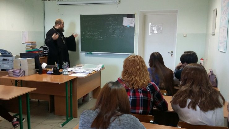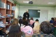 15 мая 2019 г. прошла встреча клирика Знаменского храма, заместителя директора Духовно-просветительского центра Ханты-Мансийской епархии по научной работе, иерея Тарасия Борозенца с учащимися Технолого-педагогического колледжа г. Ханты-Мансийска. На встрече присутствовали студенты двух групп первого курса, осваивающие специальности "Гостиничный сервис" и "Бухучет" в количестве двадцати пяти человек.