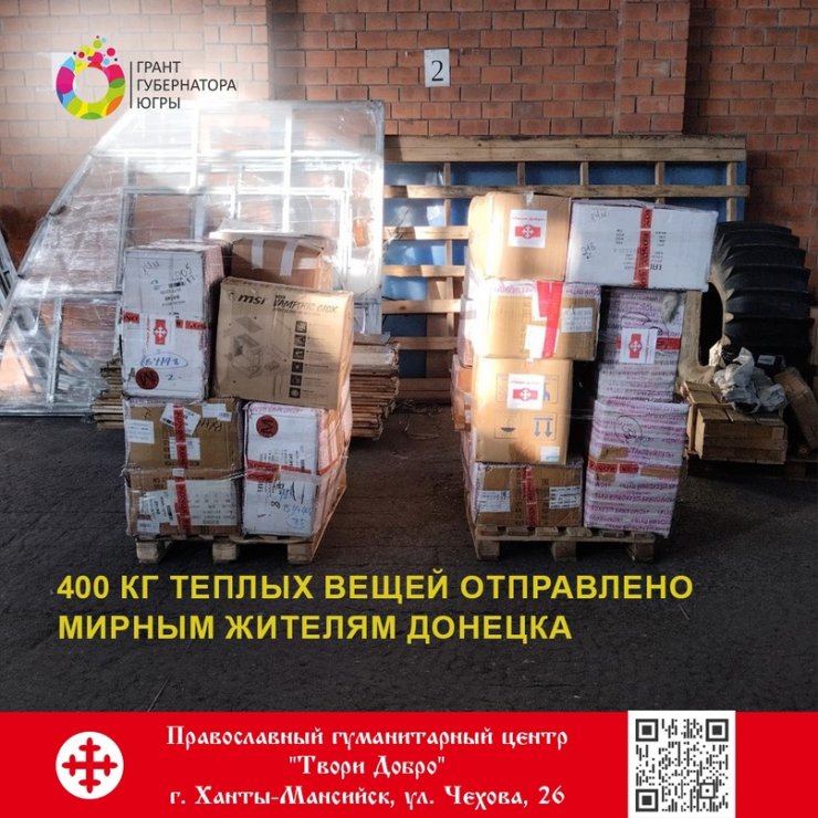 В них теплые вещи. В объеме получилось почти 4 кубометра груза, всего 423 кг. Груз отправлен транспортной компанией «Кит» в г. Ростов-на-Дону. Дончане заберут груз самостоятельно.