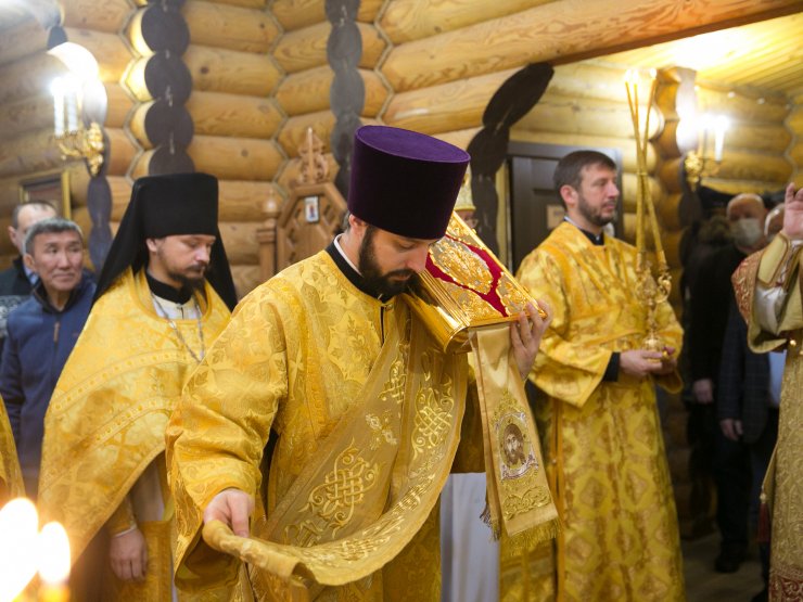 Его Высокопреосвященству сослужили: благочинный Ханты-Мансийского благочиния протоиерей Сергей Кравцов; настоятель монастыря игумен Антоний (Кирпичев), заведующий епархиальной канцелярией  иерей Александр Петюр, иерей Димитрий Губанищев, иерей Леонид Бартков, иерей Евгений Кизин, братия подворья в священном сане. Диаконский чин возглавил диакон Даниил Матвеев.