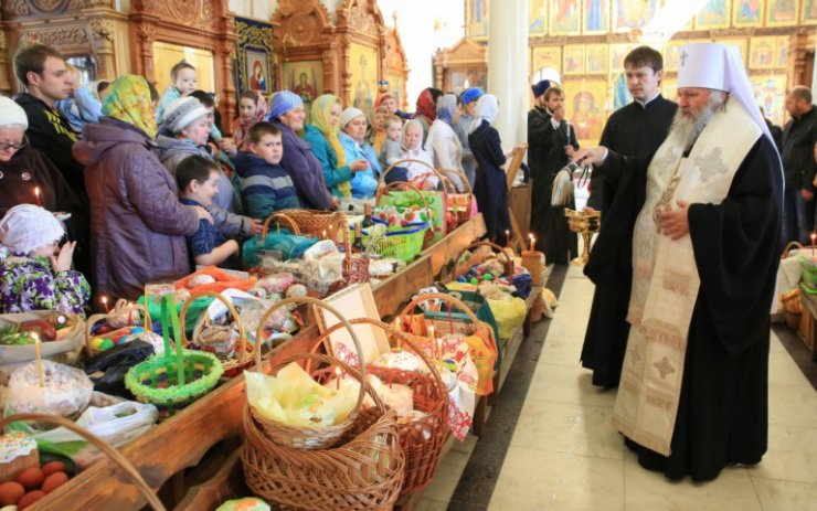 В храме в честь Покрова Божией Матери и в храме в честь иконы Божией Матери «Знамение» митрополит Павел приветствовал всех собравшихся и освятил пасхальную снедь.