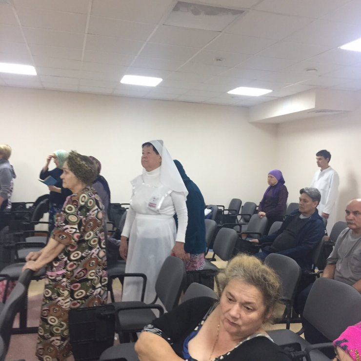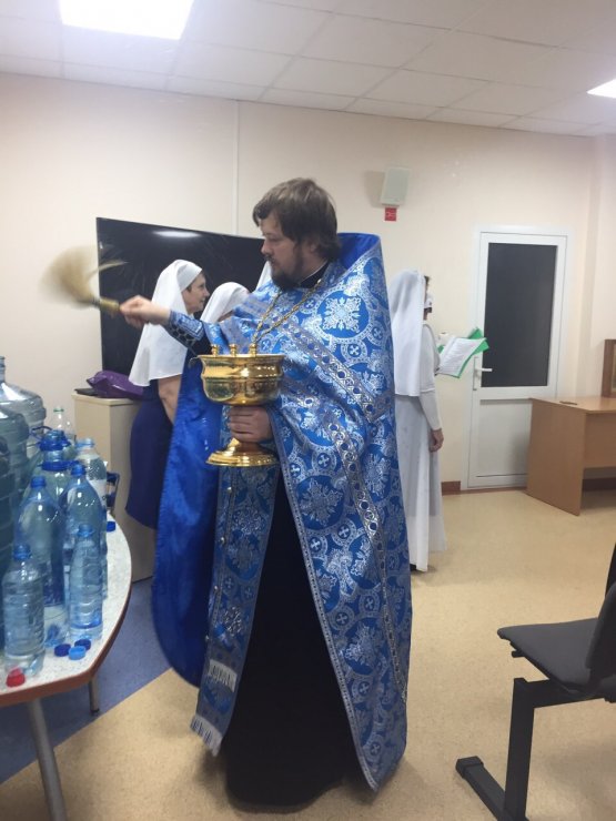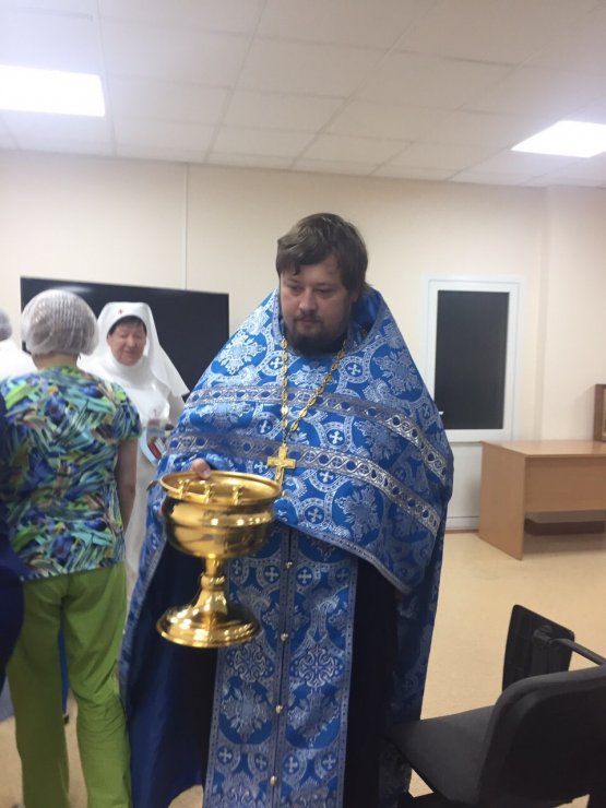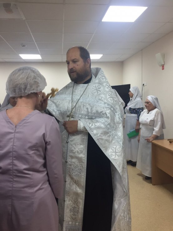 29 августа 2019 г. в конференц-зале Онкологического центра при Окружной клинической больнице г. Ханты-Мансийска состоялся водосвятный молебен перед иконой Божией Матери "Всецарица". Молебен провели председатель отдела по благотворительности и социальному служению Ханты-Мансийской епархии, настоятель храма в честь иконы Божией Матери "Знамение", иерей Леонид Бартков вместе с клириком Знаменского храма, иереем Тарасием Борозенцом и сестрами милосердия в честь преподобномучениц Великой Княгини Елисаветы и инокини Варвары. В молебне приняли участие врачи, медсестры и пациенты. По завершению молебна отец Тарасий обратился к присутствующим со словом проповеди, в которой раскрыл православное отношение к онкологии и пожелал всем помощи Божией в лечении и преодолении недуга рака.