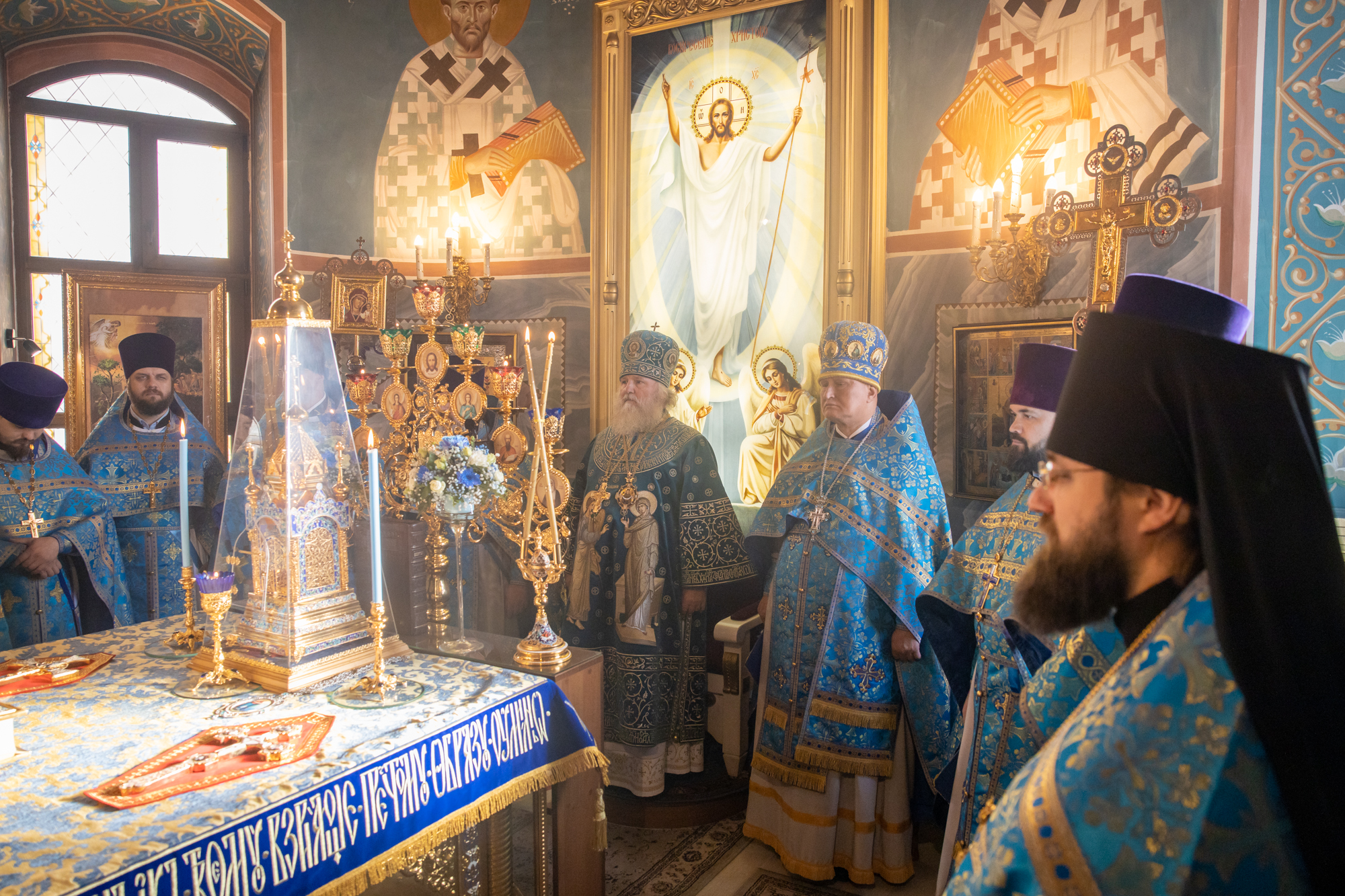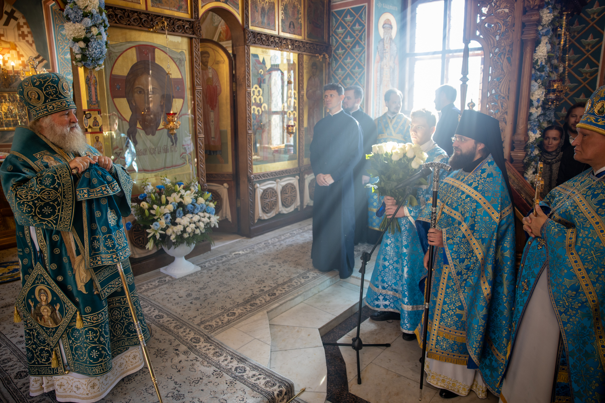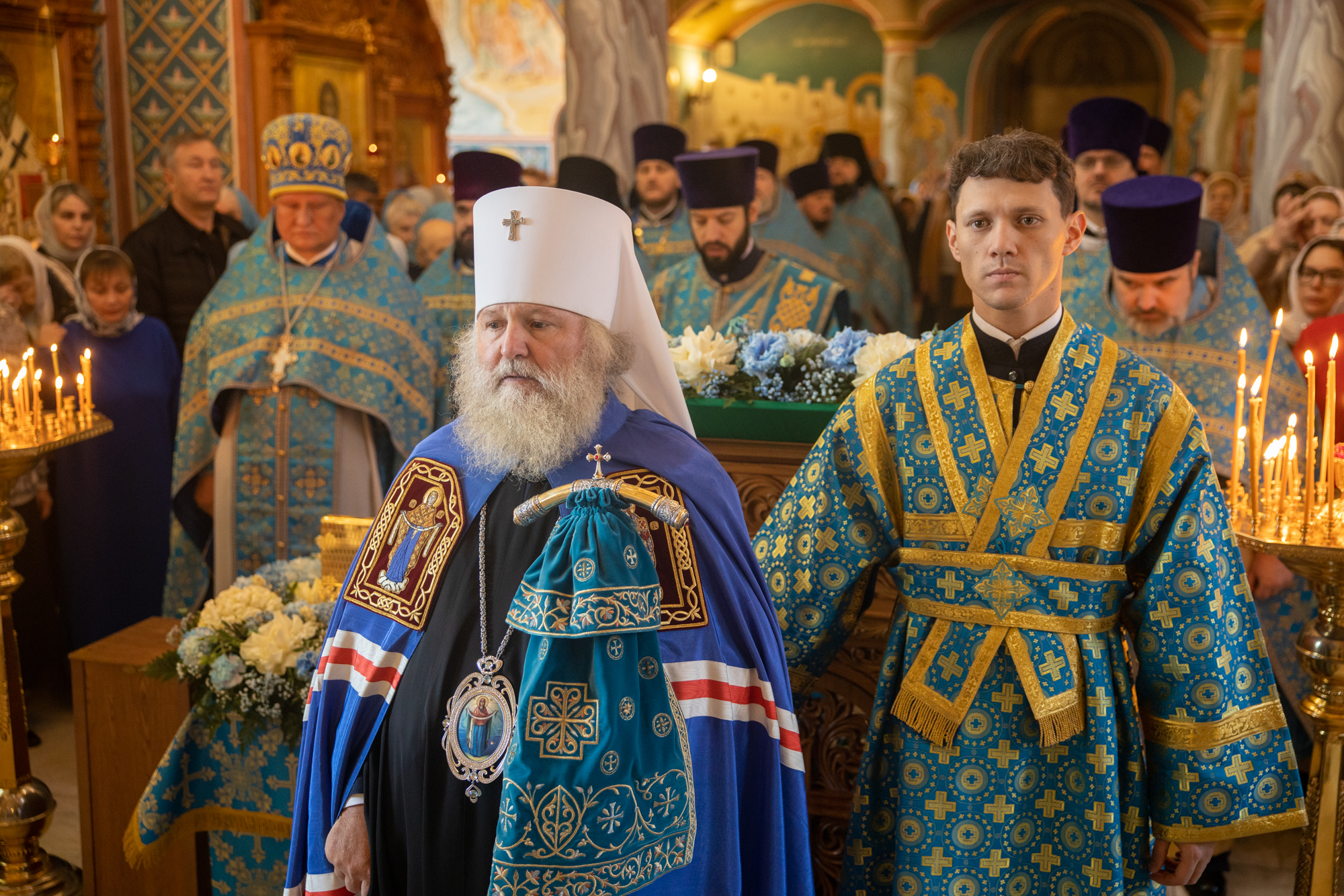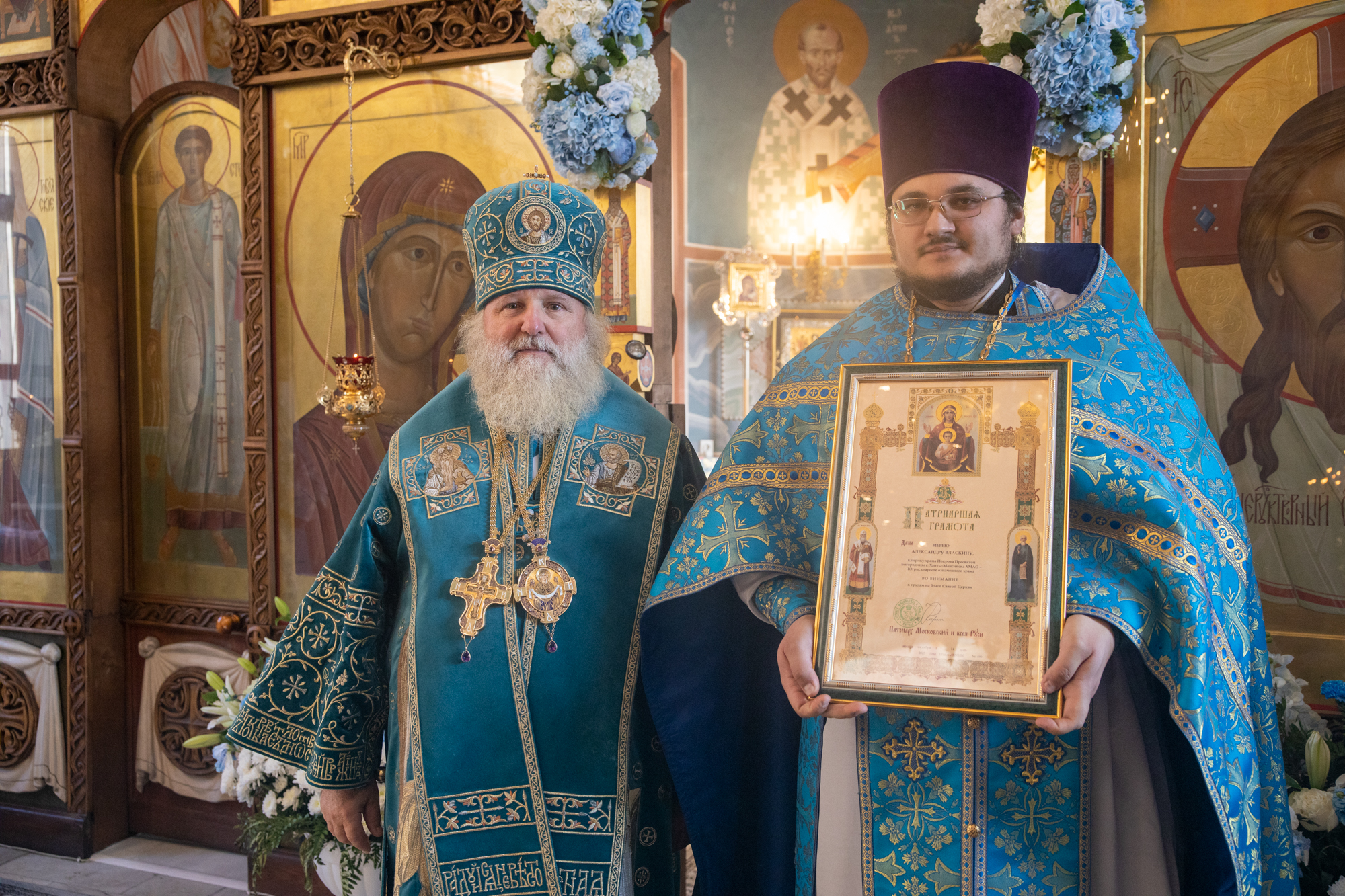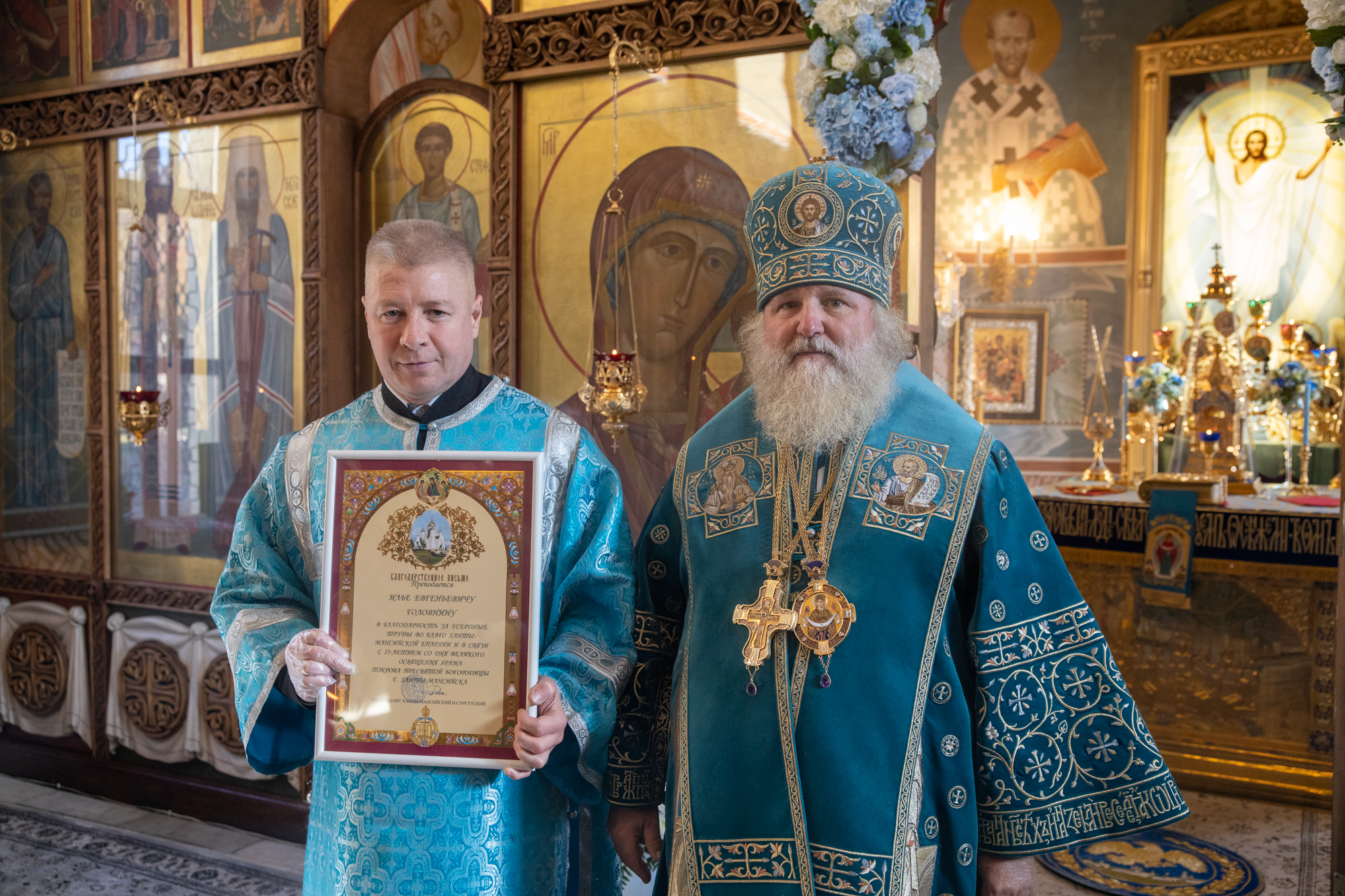 Его Высокопреосвященству сослужили: секретарь Ханты-Мансийской епархии игумен Антоний (Кирпичев), секретарь Югорской епархии иерей Николай Щерба, настоятель храм в честь Рождества Пресвятой Богородицы г. Урай протоиерей Иоанн Юрцун, настоятель храма иерей Леонид Бартков, духовенство города Ханты-Мансийска. Диаконский чин возглавил диакон Даниил Матвеев.