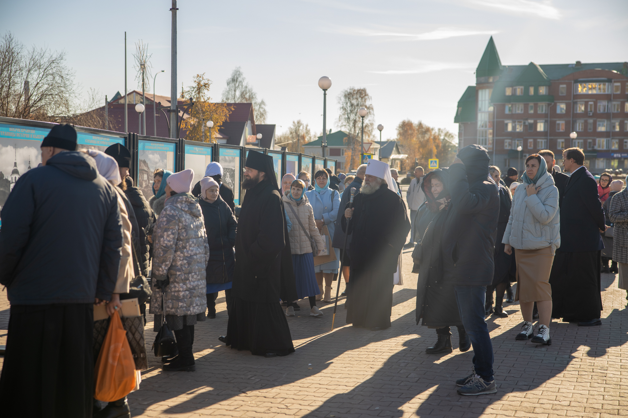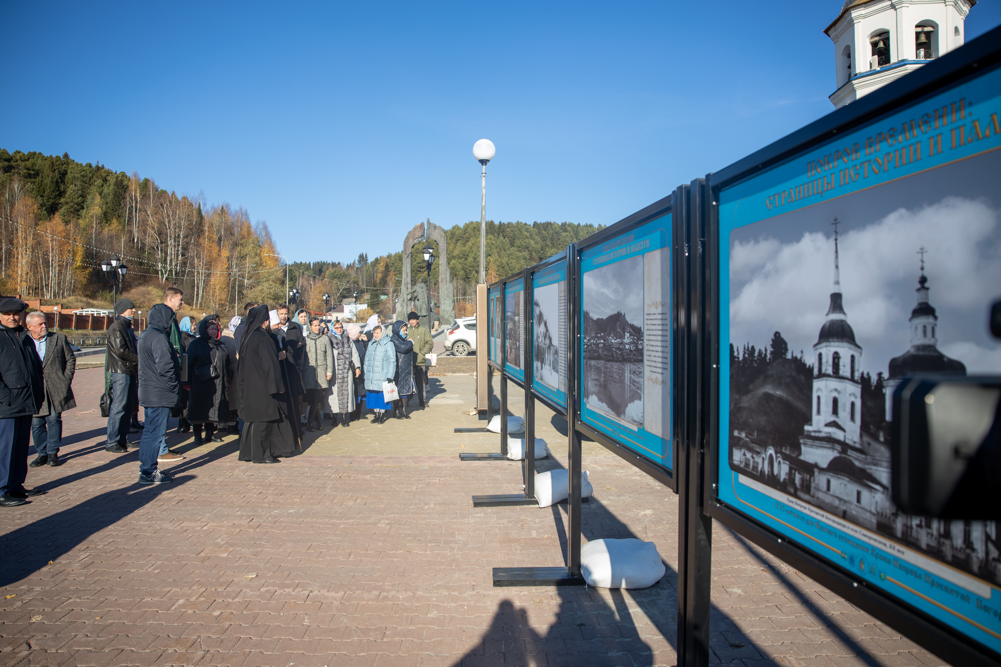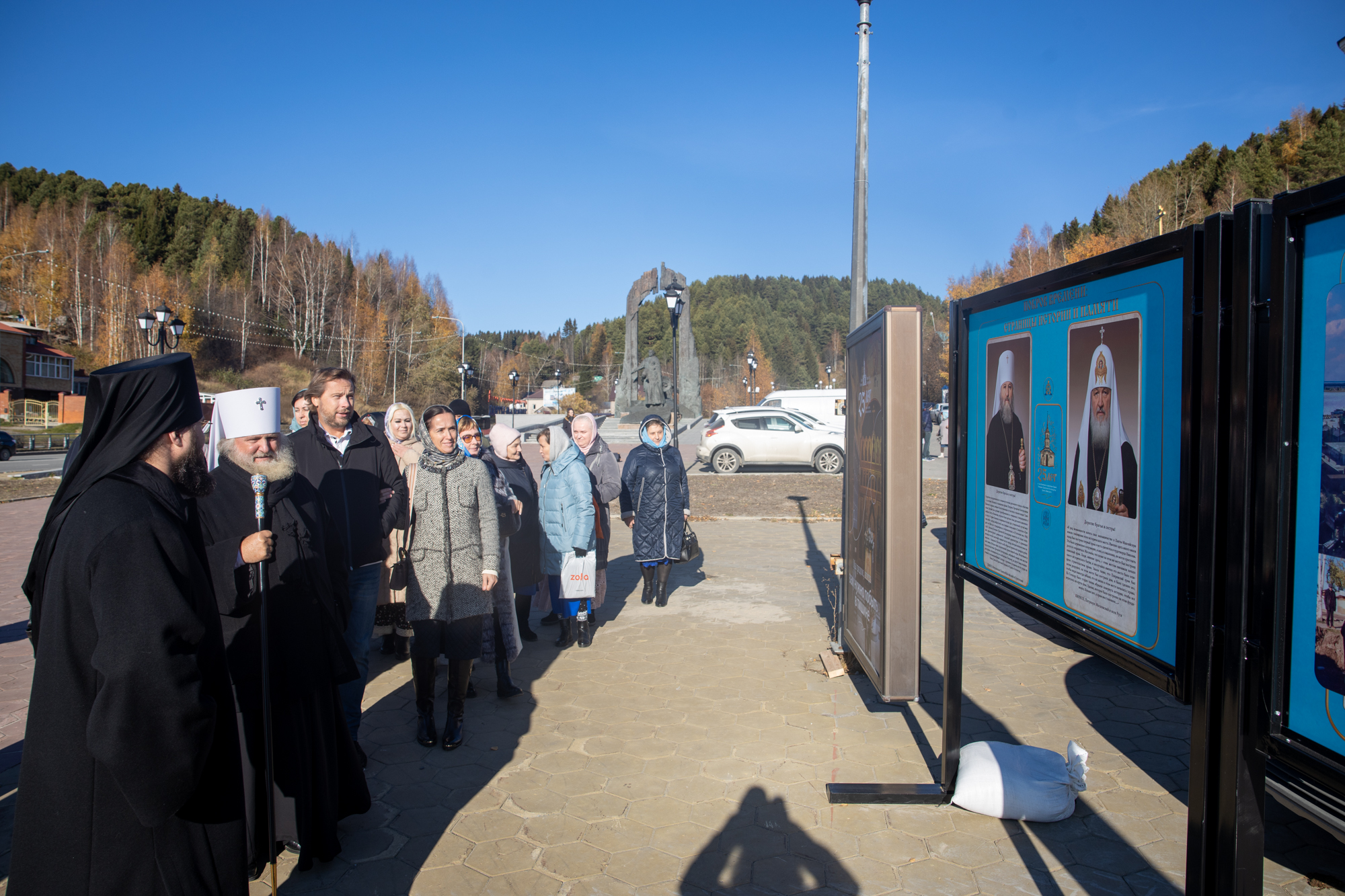 Митрополит Павел возложил цветы к подножию памятной стелы и осмотрел панно с изображением исторических событий времён трудового подвига.