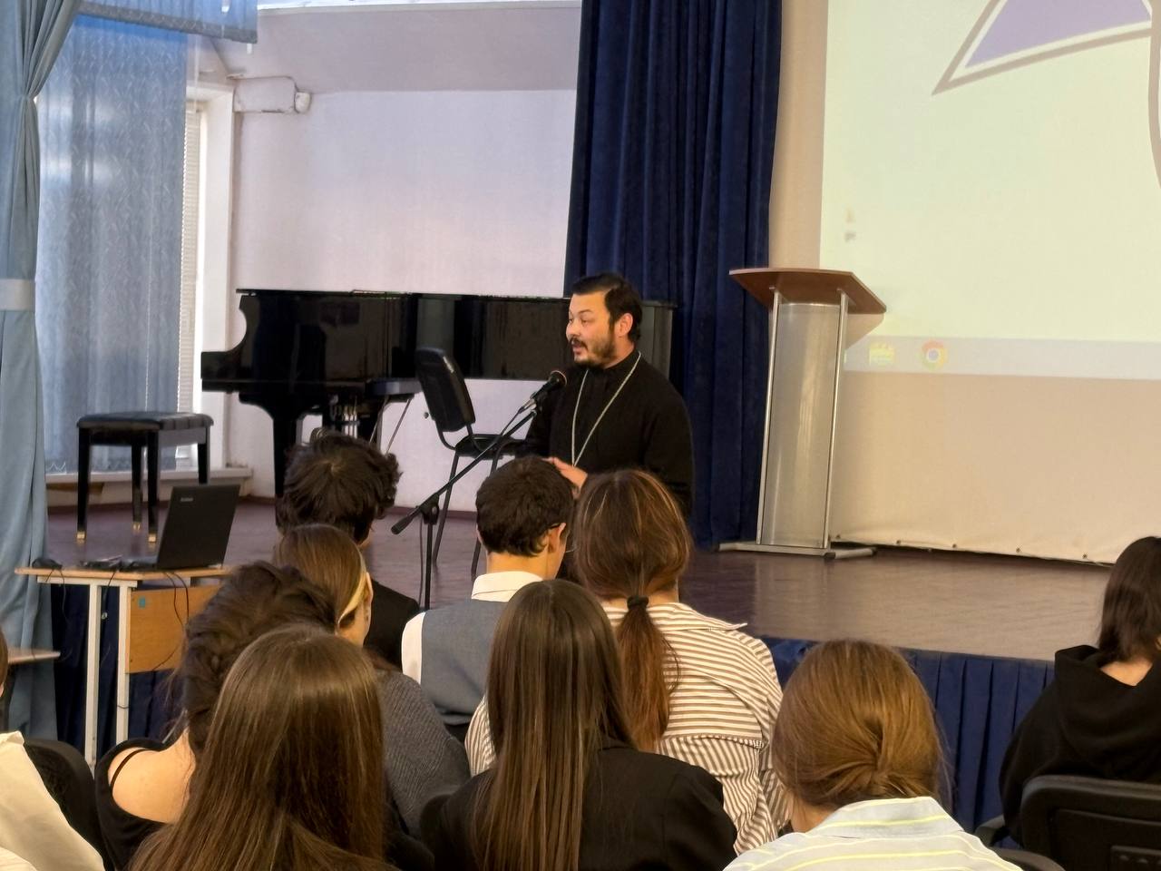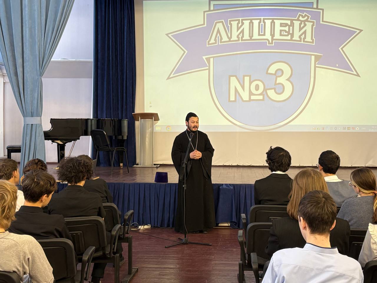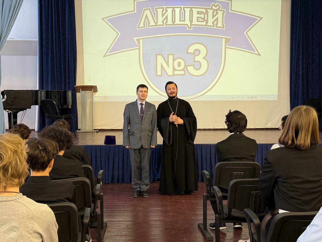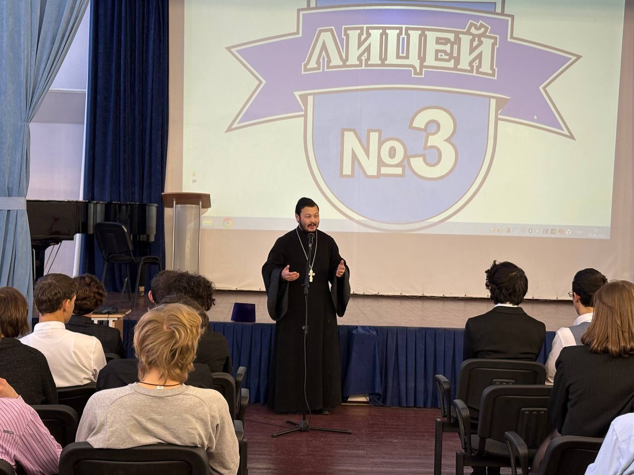 Во время урока священник рассказал об истории празднования Дня Героев Отечества, который до 1917 года назывался Днем Георгиевских кавалеров, остановился на повествовании о героях России на протяжении всей ее истории, особо остановился на подвиге соотечественников в годы Великой Отечественной войны, а также на современных героях., среди которых есть и священнослужители.