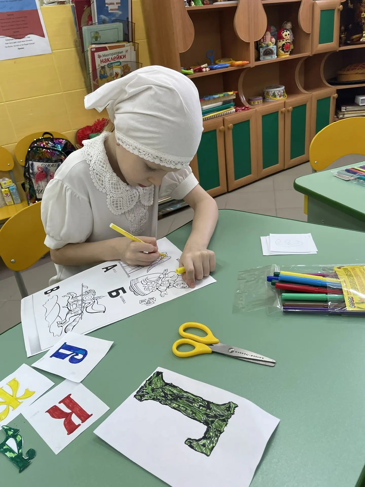В ходе занятия дети раскрашивали и вырезали буквы и составляли из них слова! Дети, которые уже научились читать, демонстрировали свои умения, и малыши с удовольствием слушали своих друзей! Старославянские названия частей тела заинтересовали всех! Особенно, когда им предложили показывать эти части тела на себе и проговаривать это на старославянском языке: очи, длани, персты, десница-шуйца…
