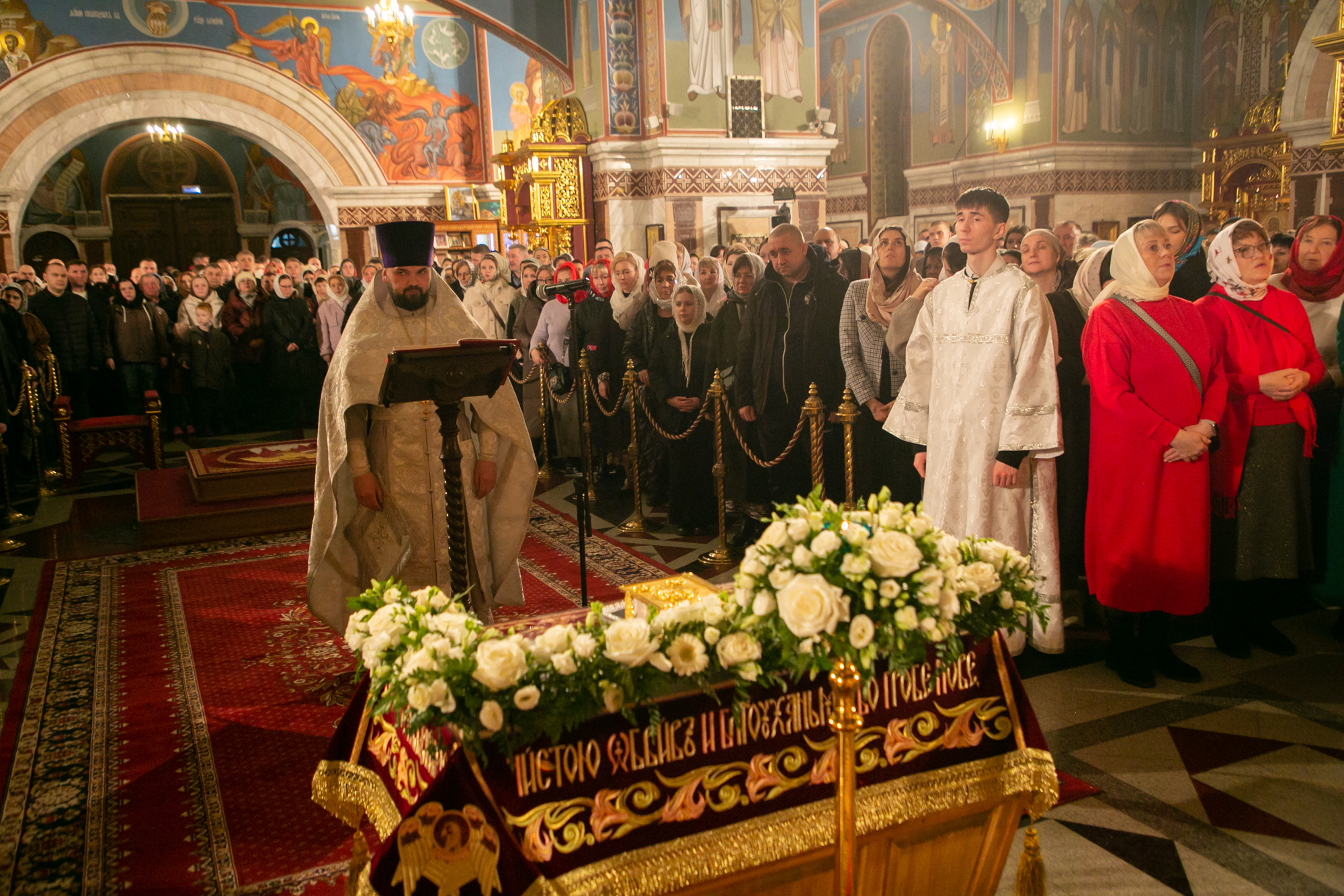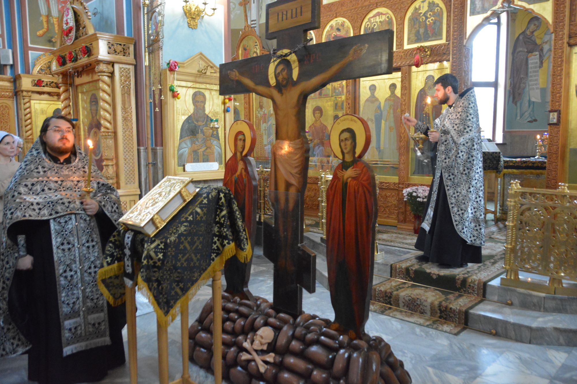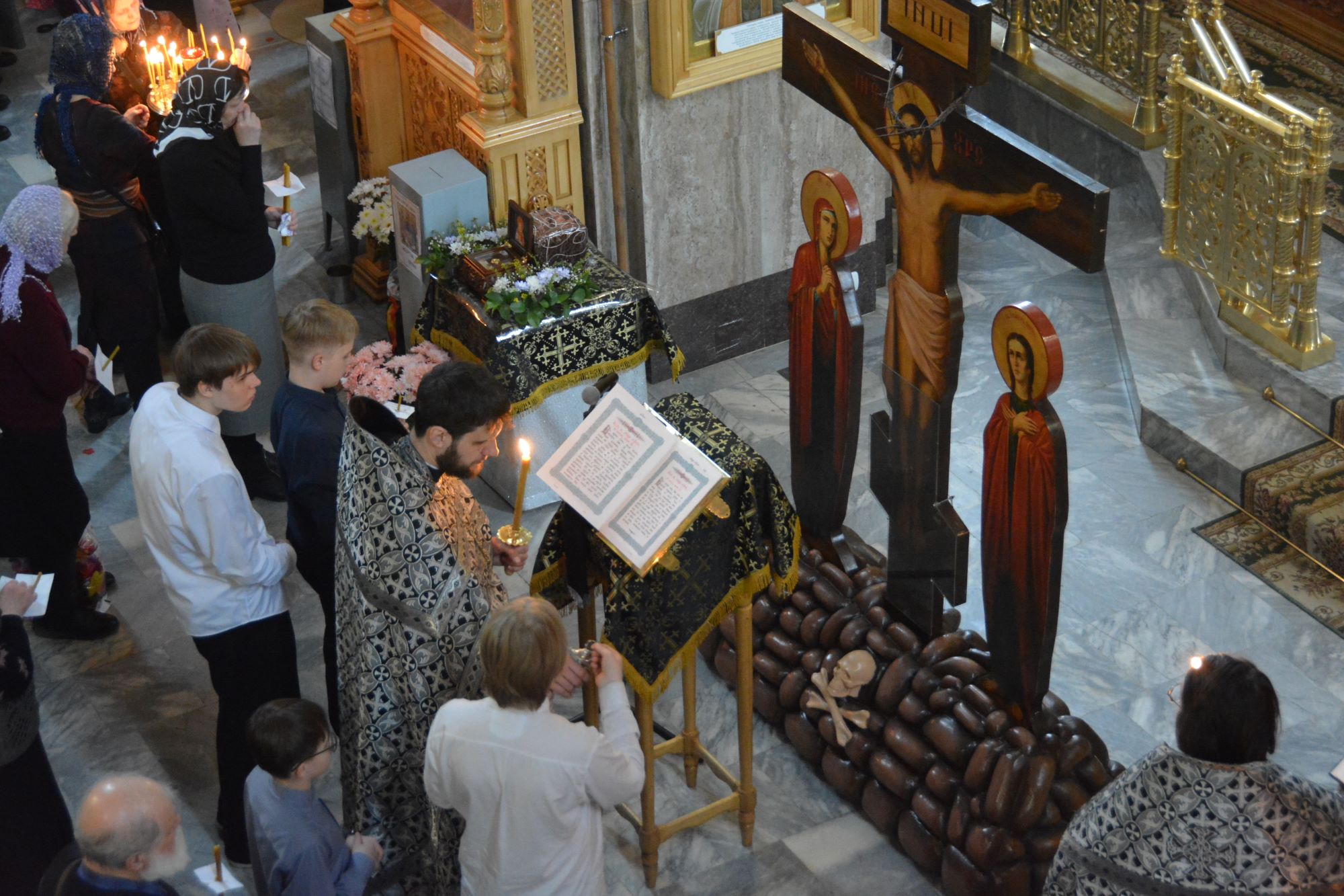 За богослужением пел хор. В храме молились прихожане. На тропарях «Благообразный Иосиф» отец Иоанн Дарий вынес Плащаницу на специально уготованную и украшенную цветами гробницу в середине храма, произнёс проповедь, стоя у Плащаницы, затем был пропет умилительный канон на Плач Богоматери.