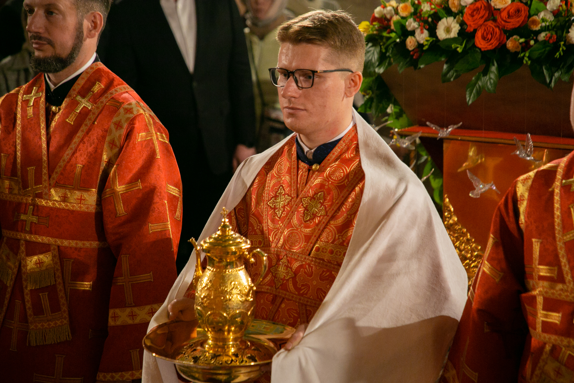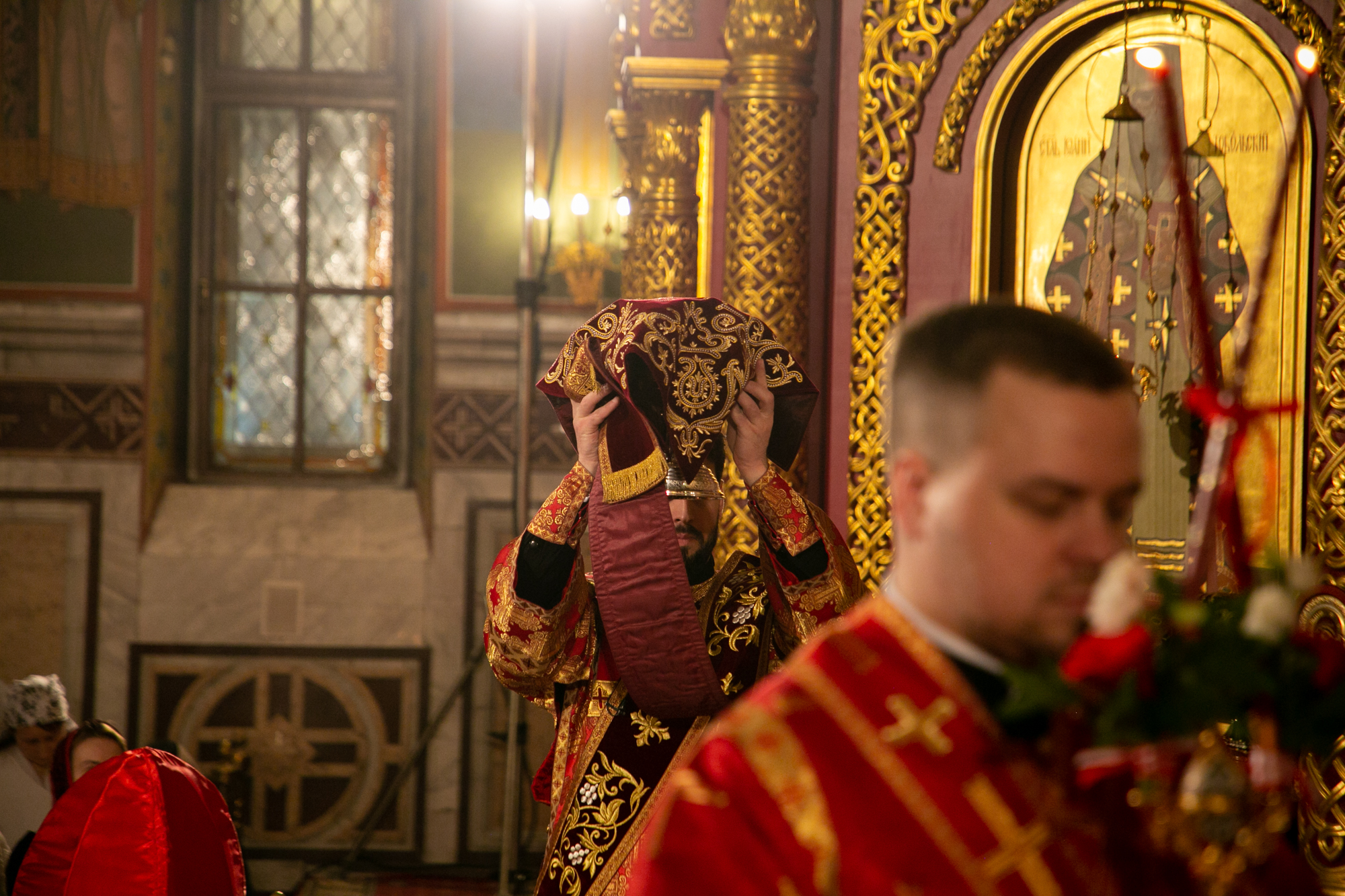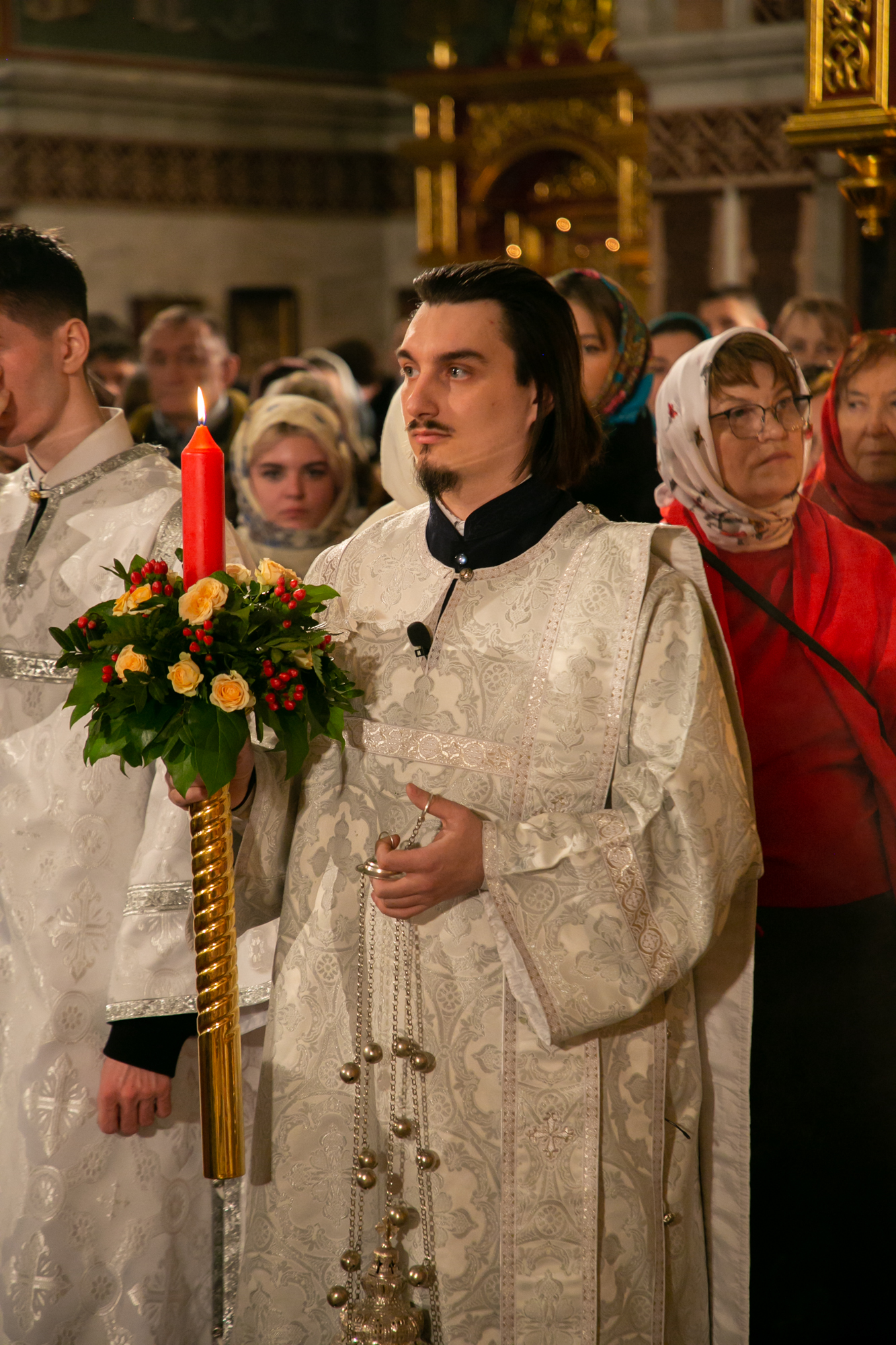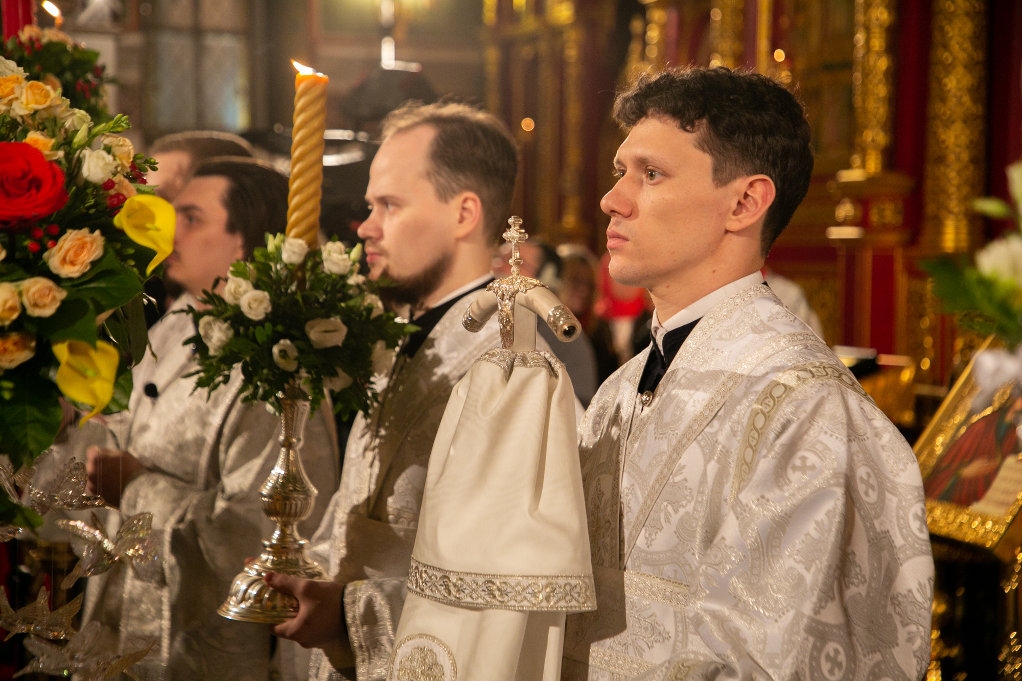 По традиции Великой субботы после апостольского чтения перед чтением Евангелия священнослужители сменили черные постные облачения на белые.