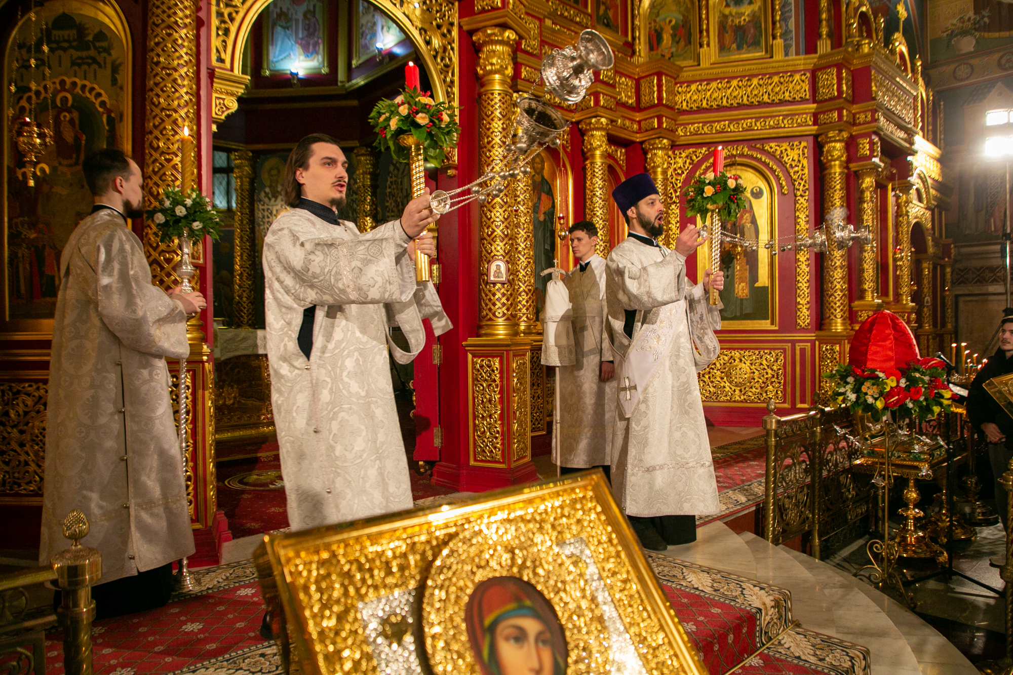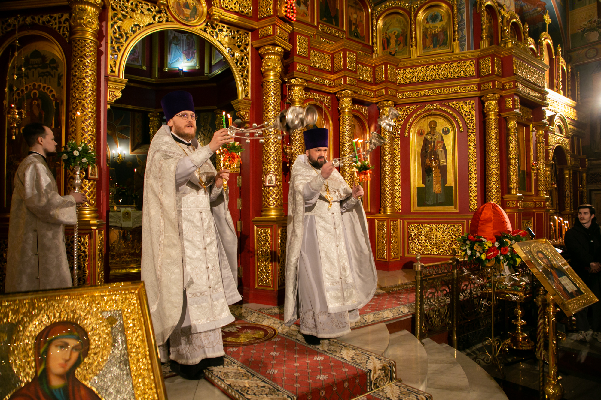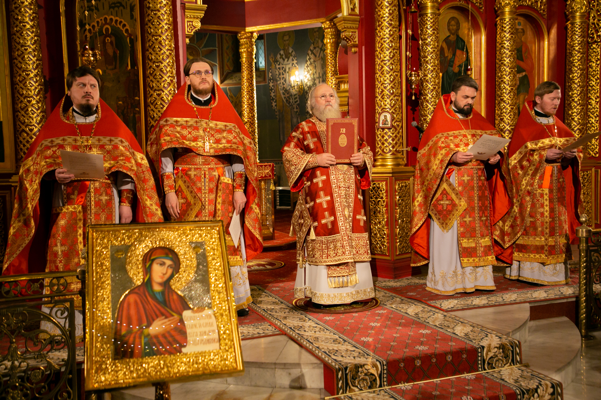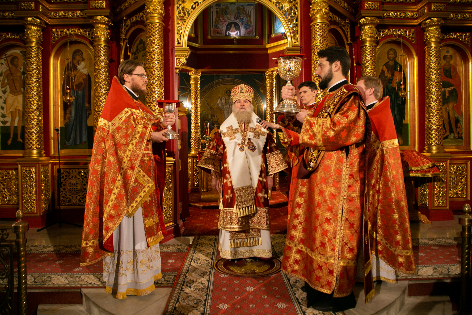 Его Высокопреосвященству сослужили: благочинный Ханты-Мансийского благочиния иерей Димитрий Губанищев, ключарь собора иерей Александр Петюр, иерей Евгений Набоков, иерей Антоний Долгушин, диакон Даниил Матвеев, диакон Владимир Гах.