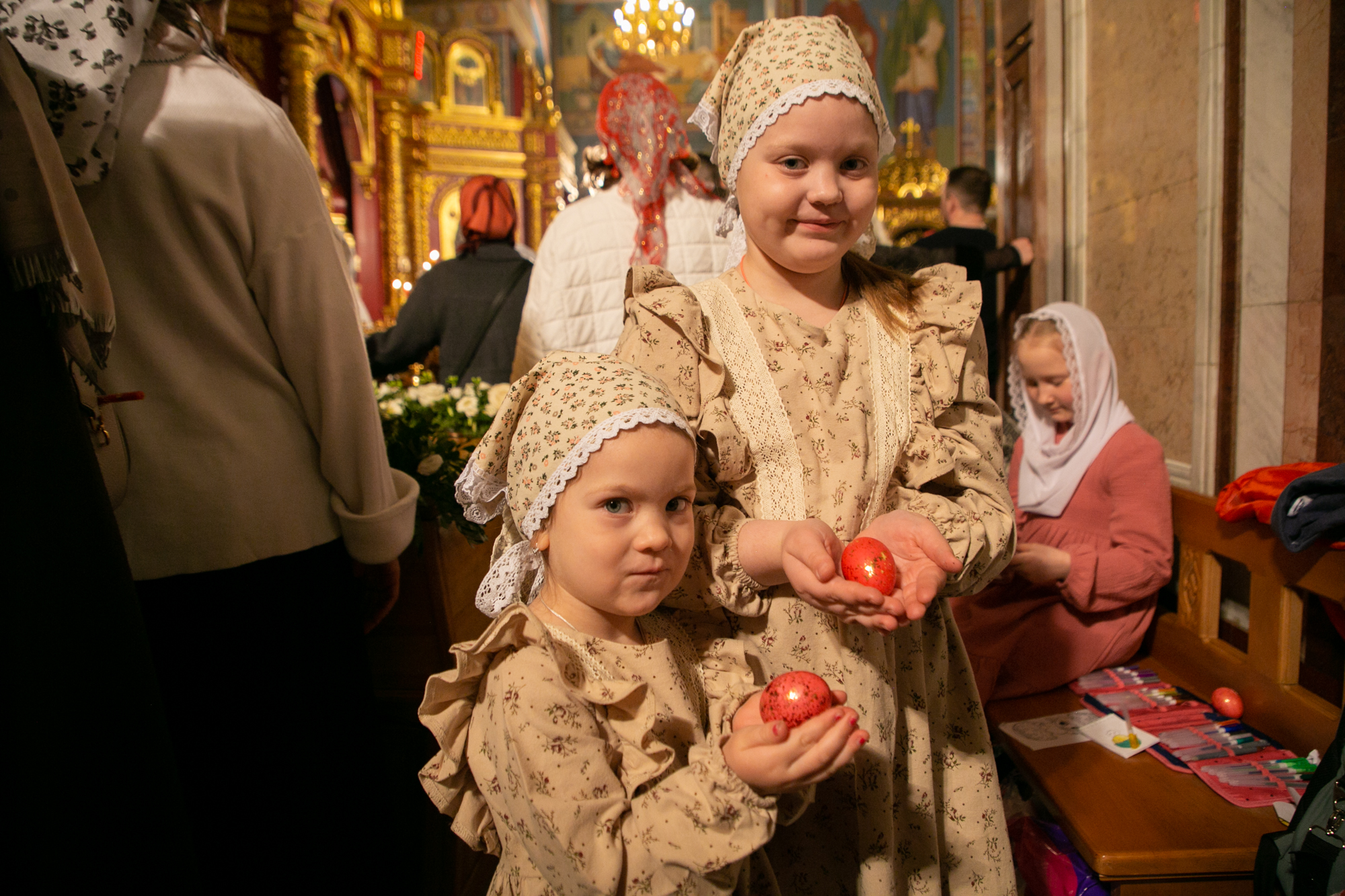 Рано утром помощники и дежурные храма украсили помещение цветочными композициями, декоративными яйцами и выставили творческие работы детей. Заранее были установлены столы, чтобы прихожане могли разместить для освящения праздничные угощения.