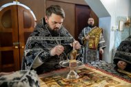 Его Высокопреосвященству сослужили: благочинный Ханты‑Мансийского благочиния иерей Димитрий Губанищев, секретарь Ханты‑Мансийской епархии игумен Антоний (Кирпичев), настоятель Знаменского храма иерей Леонид Бартков, клирики храма иерей Андрей Зотов, иерей Тарасий Борозенец и диакон Алексий Полянцев; диаконский чин возглавил диакон Даниил Матвеев. Совершение Литургии Преждеосвященных Даров архипастырем стало для прихода видимым свидетельством церковного единства и общей молитвы всей епархии.