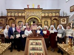 В этот же день в Знаменском храме прошло торжественное вручение свидетельств участникам курсов профессиональной подготовки по специальности «Младшая медицинская сестра по уходу за больными». Среди слушателей курсов были сестры милосердия Православного сестричества милосердия и добровольцы Православного гуманитарного центра «Твори Добро», которые уже несут служение при храме и в социальных учреждениях.