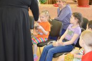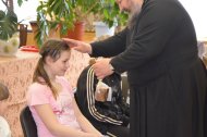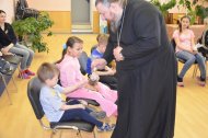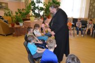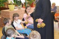 В это же время другой клирик Знаменского храма – отец Константин Мемячкин, поздравил воспитанников Центра социальной помощи семье и детям «Вега» г. Ханты-Мансийска со Светлым Христовым Воскресением, рассказал о празднике Пасхи и подарил книги православного содержания и кулич.