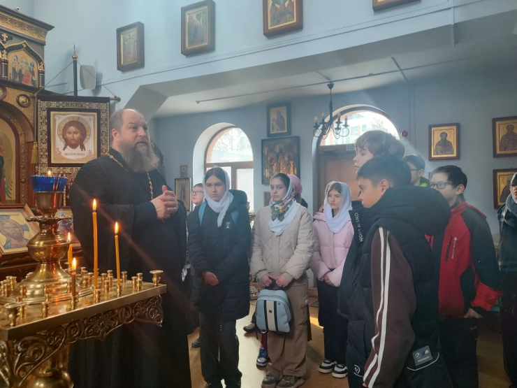 Священник рассказал школьникам об истории строительства храма и становлении Знаменской общины, об устройстве церкви и её святынях, а также о назначении храма в жизни православных христиан. Ребята узнали, что такое клирос, иконостас, мощи святых, иконы, алтарь, аналой и паникадило.