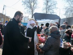 В храме в честь иконы Божией Матери «Знамение» митрополит Павел приветствовал всех собравшихся и освятил пасхальную снедь.