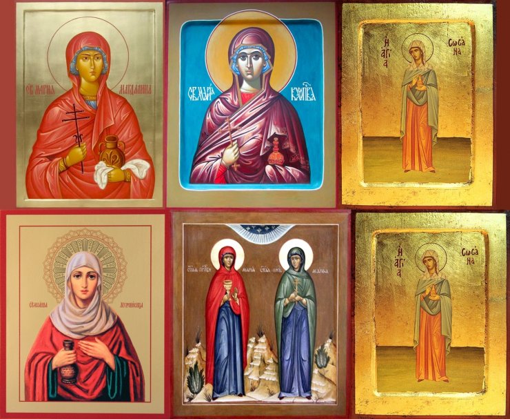 Женам-мироносицам первым явился воскресший Иисус. От них произошло пасхальное приветствие «Христос Воскресе!» В православной традиции женами-мироносицами считаются святые: Мария Магдалина, Мария Клеопова, Саломия, Иоанна, Марфа и Мария; Сусанна и иные...
