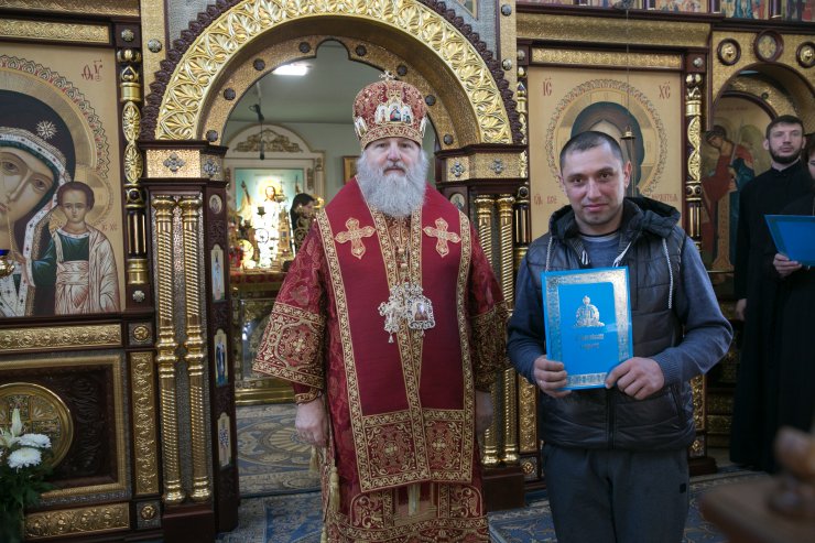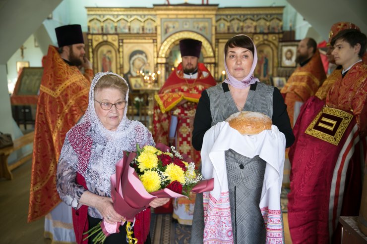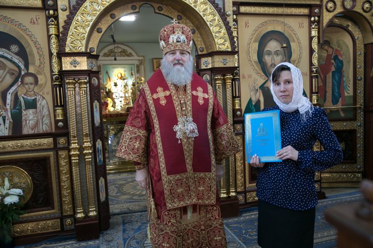 Затем владыка Павел наградил архиерейской граматой за услуги перед Ханты-Мансийской епархией прихожан Знаменского храма, супругов Гелета Василия Степановича и Гелета Анастасию Александровну.