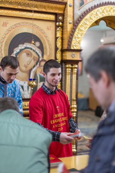 По окончании проповеди активисты приходского молодежного движения раздали всем присутствующим памятные иконки и Евангелия.