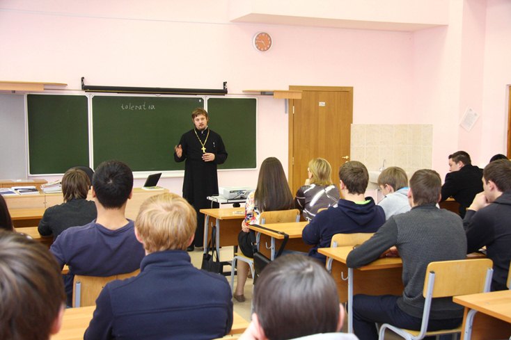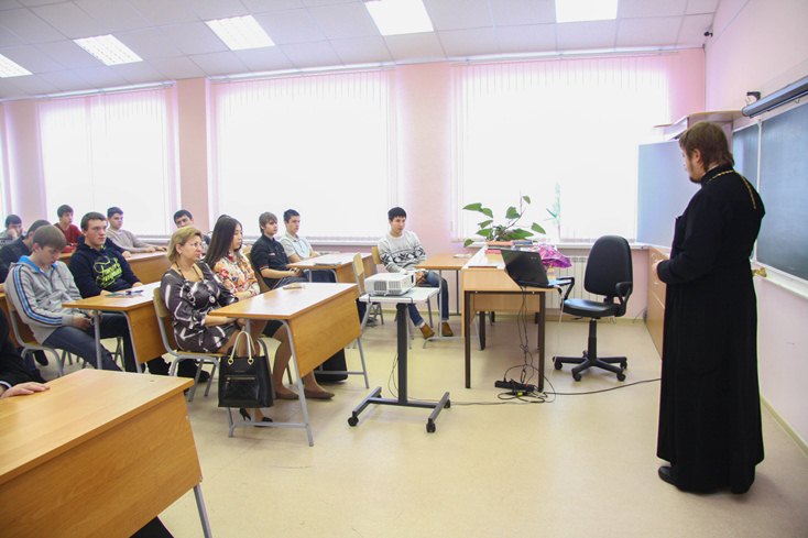 13 ноября в рамках проведения в Ханты-Мансийском технолого-педагогическом колледже Недели толерантности была организована встреча со священником, председателем отдела социального служения и благотворительности, настоятелем храма в честь иконы Божией Матери «Знамение» Леонидом Леонидовичем Бартковым. На мероприятии присутствовали студенты 923, 922 и 583 групп. Речь шла о человеческих отношениях, которые должны строиться на терпимости, любви, добре, уважении. Иерей Леонид говорил о счастье и интересовался, знают ли студенты, что это такое и счастливы ли они. Один из студентов ответил, что он счастлив, потому что его мама не болеет. Значит, есть у современной молодежи те ценностные ориентиры, которым они должны следовать в жизни. Гость познакомил с книгой Дениса Олеговича Фесенко «Пустые песочницы», затрагивающей важный вопрос: «С какого момента будущий ребенок начинает жить?» Брошюра написана для широкого круга читателей, склонных к размышлению. На встрече обсуждалось содержание пословицы «Береги честь с молоду», которое приобретает в наше время особую значимость. Поэтому студенты активно участвовали в обсуждении данной проблемы.