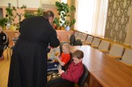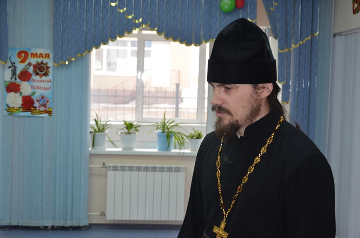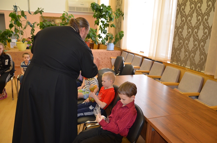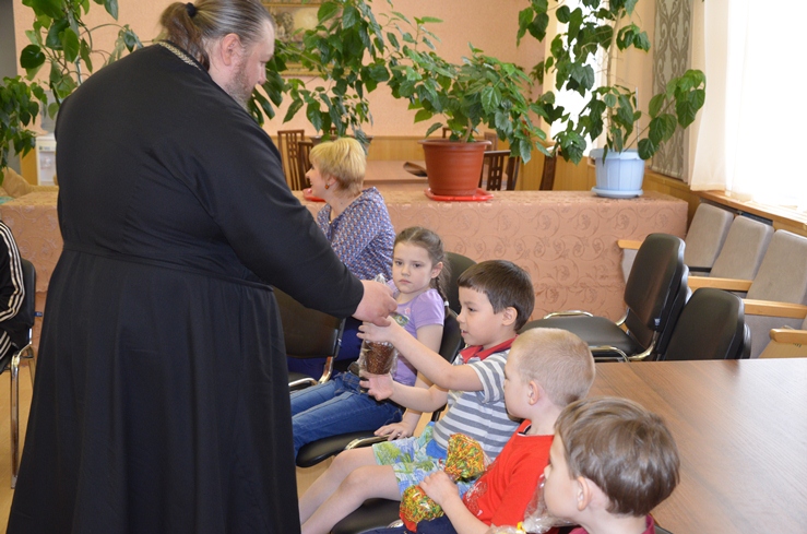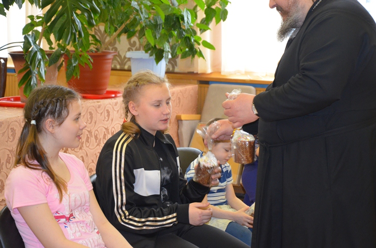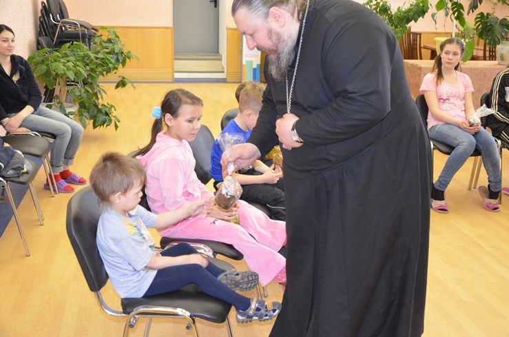 В это же время другой клирик Знаменского храма – отец Константин Мемячкин, поздравил воспитанников Центра социальной помощи семье и детям «Вега» г. Ханты-Мансийска со Светлым Христовым Воскресением, рассказал о празднике Пасхи и подарил книги православного содержания и кулич.