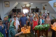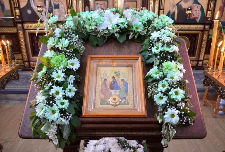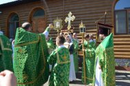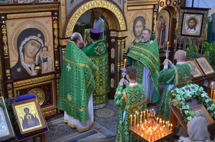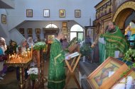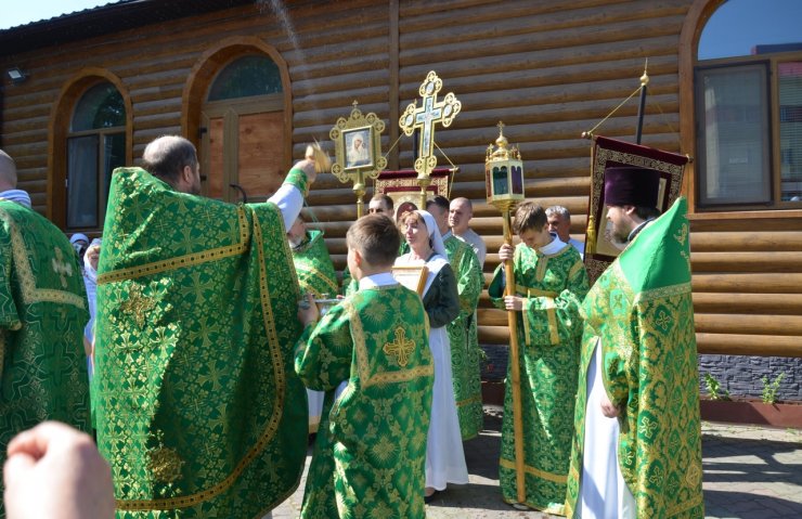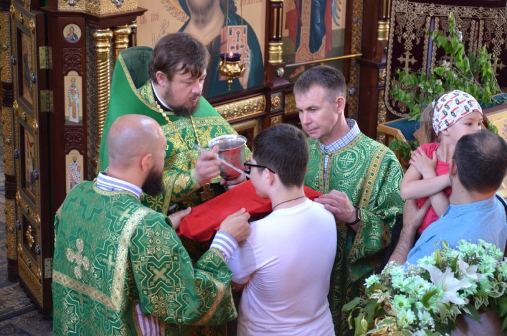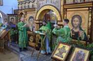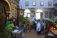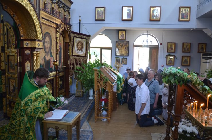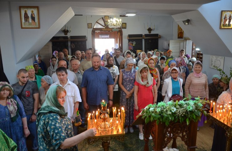 На праздничное богослужение в храме собралось много прихожан. Еще накануне вечером храм был убран свежескошенной зеленью и ветками березы, в вазах цветы. Батюшки служили в зеленом облачении.