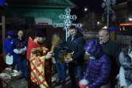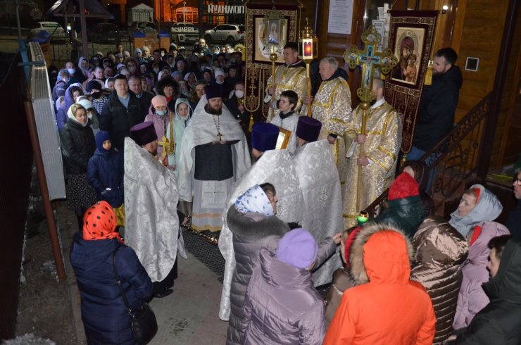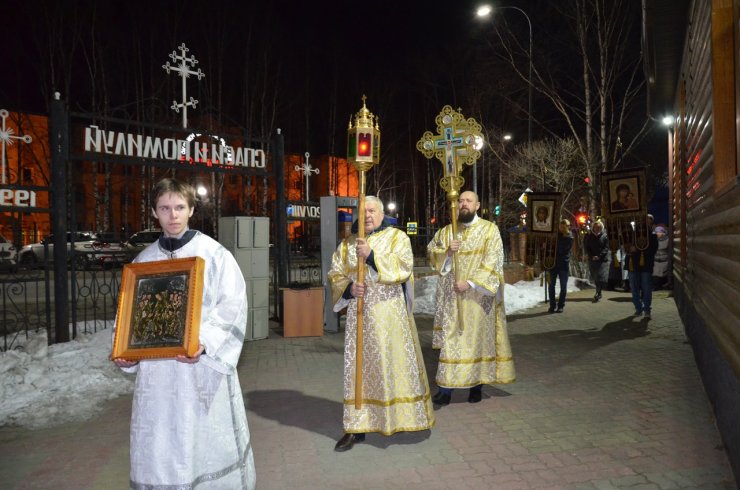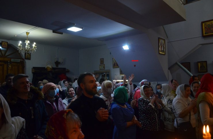 Затем, выйдя из алтаря, совершили крестный ход вокруг храма вместе с прихожанами, с пением той же стихиры. Позже началась служба Пасхальной заутрени, во время которой поется радостный пасхальный тропарь:
