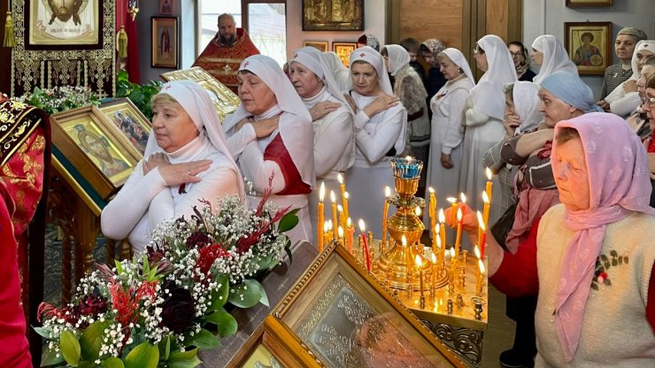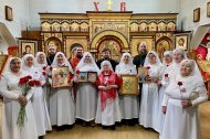 Всем молящимся за богослужением женщинам, девочкам был вручен цветок и плитка шоколада.