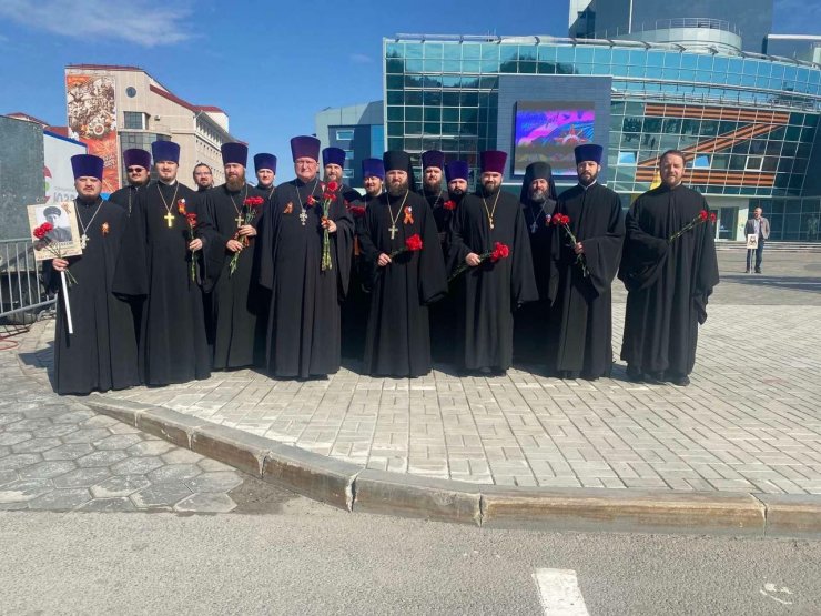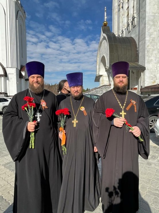 По окончании молебна духовенство приняло участие в торжественном открытии парада-прохождения военизированных подразделений, ветеранов боевых действий, кадетских классов, юнармейских отрядов, военной и раритетной техники. В торжественном шествии жителей города «Бессмертный полк» с возложением цветов к Вечному огню Мемориала Славы в Парке Победы участвовали священнослужители, прихожане храмов города Ханты- Мансийска, воспитанники православной гимназии.