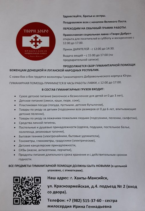 ПЕРЕХОДИМ НА ОБЫЧНЫЙ ГРАФИК РАБОТЫ. Православная социальная лавка "Твори Добро" открыта для посетителей в субботу и воскресенье с 12:00 до 17:00.