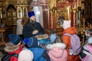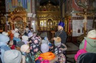 Клирик храма в честь иконы Божией Матери «Знамение» иерей Тарасий Борозенец также принял участие в данном мероприятии, пообщался с ребятами из Горноправдинска, провел экскурсию по Собору, рассказал об устройстве и символике православного храма, православной настенной живописи, иконах, мощах святых и, конечно же, о Рождестве Христовом.