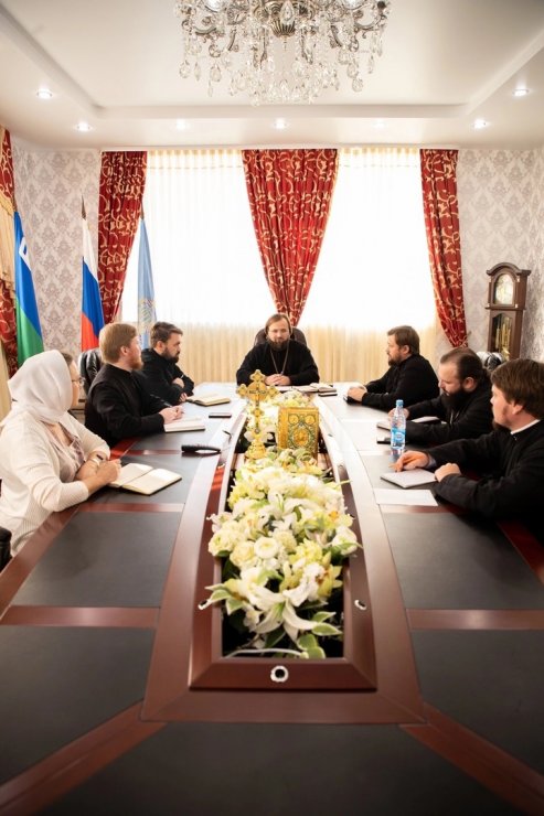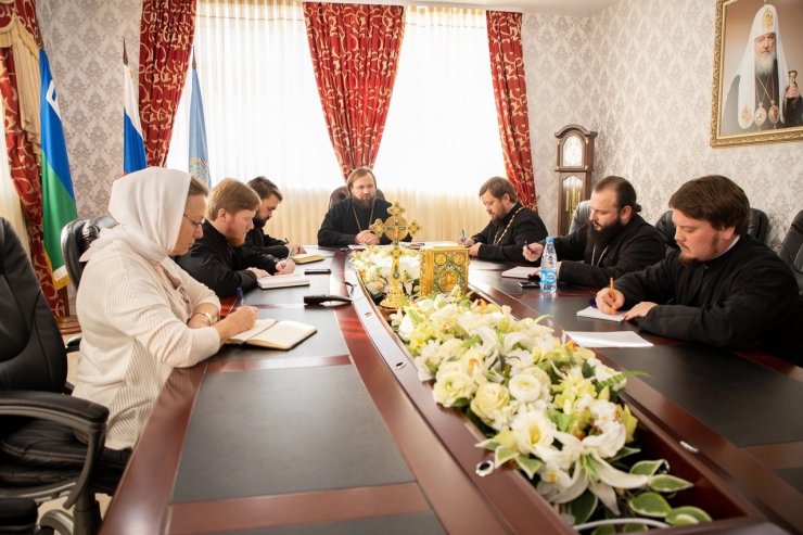 В заседании приняли участие: председатель - игумен Антоний Кирпичев, руководитель отдела социального служения и благотворительности ХМЕ, настоятель Знаменского храма иерей Леонид Бартков, и др. руковолители профильных отделов Ханты-Мансийской епархии.