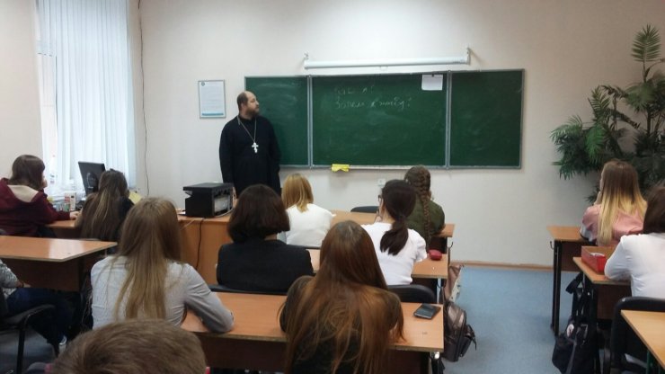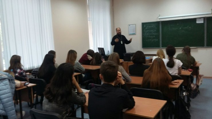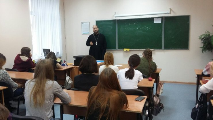 10 октября 2019 г. прошла встреча клирика Знаменского храма, заместителя директора Духовно-просветительского центра Ханты-Мансийской епархии по научной работе, иерея Тарасия Борозенца с учащимися Технолого-педагогического колледжа г. Ханты-Мансийска. На встрече присутствовали студенты, обучающиеся по специальности "Документооборот и архивоведение" в количестве двадцати пяти человек.