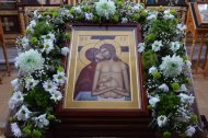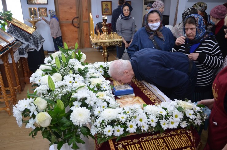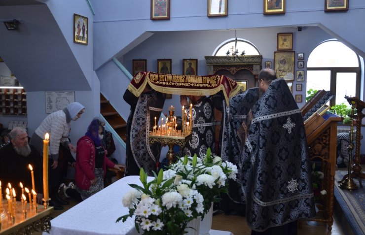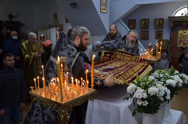 В Великую пятницу страстной седмицы, воспоминание святых спасительных Страстей Господа нашего Иисуса Христа, настоятель Знаменского храма иерей Леонид Бартков совершил вечерню с выносом Плащаницы Спасителя в храме в честь иконы Божией Матери «Знамение» г. Ханты-Мансийска.