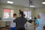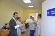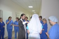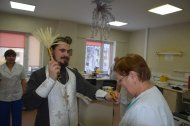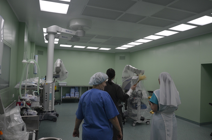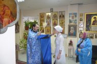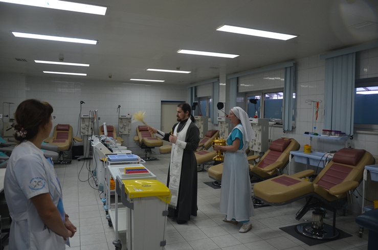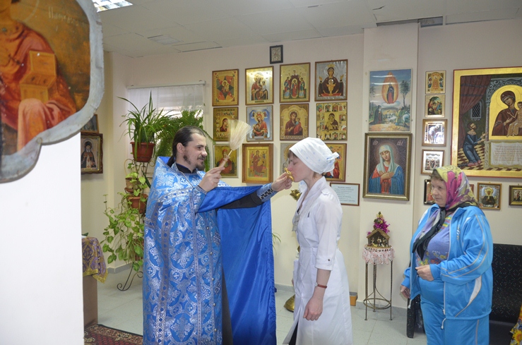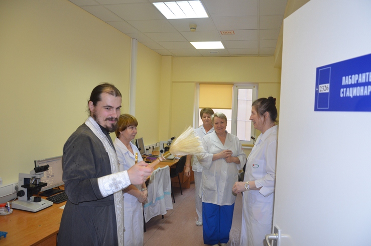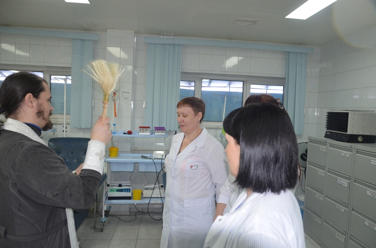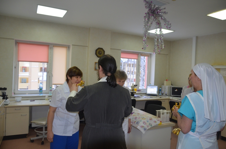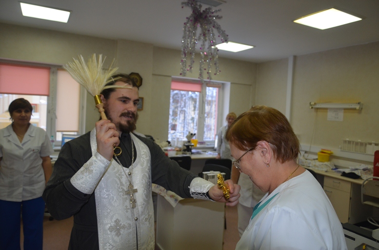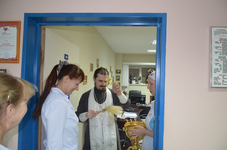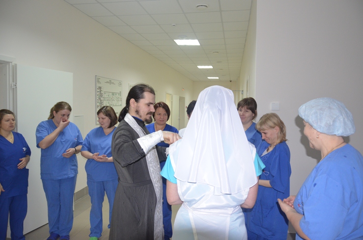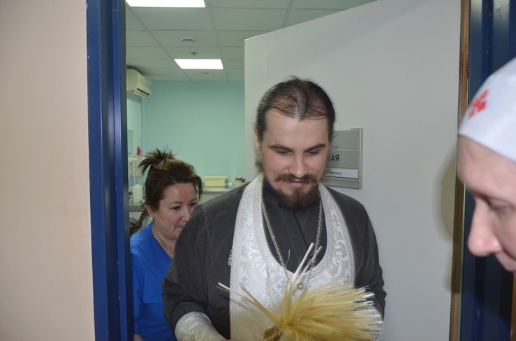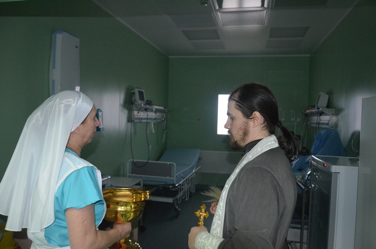 Затем отец Владимир, по просьбе врачей некоторых отделений, окропил святою водою операционные блоки, палаты больных и другие больничные помещения.